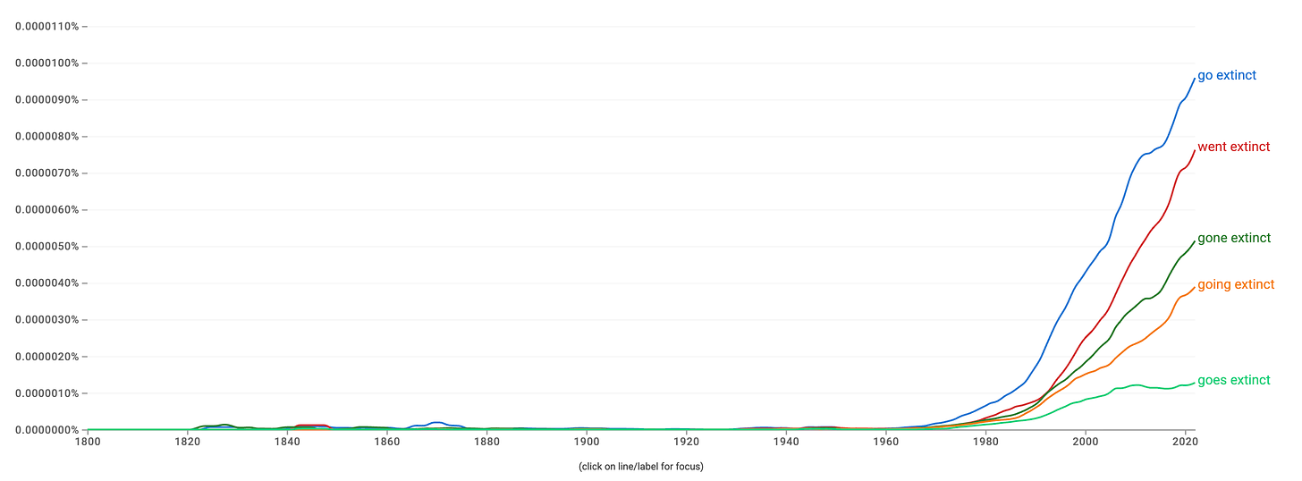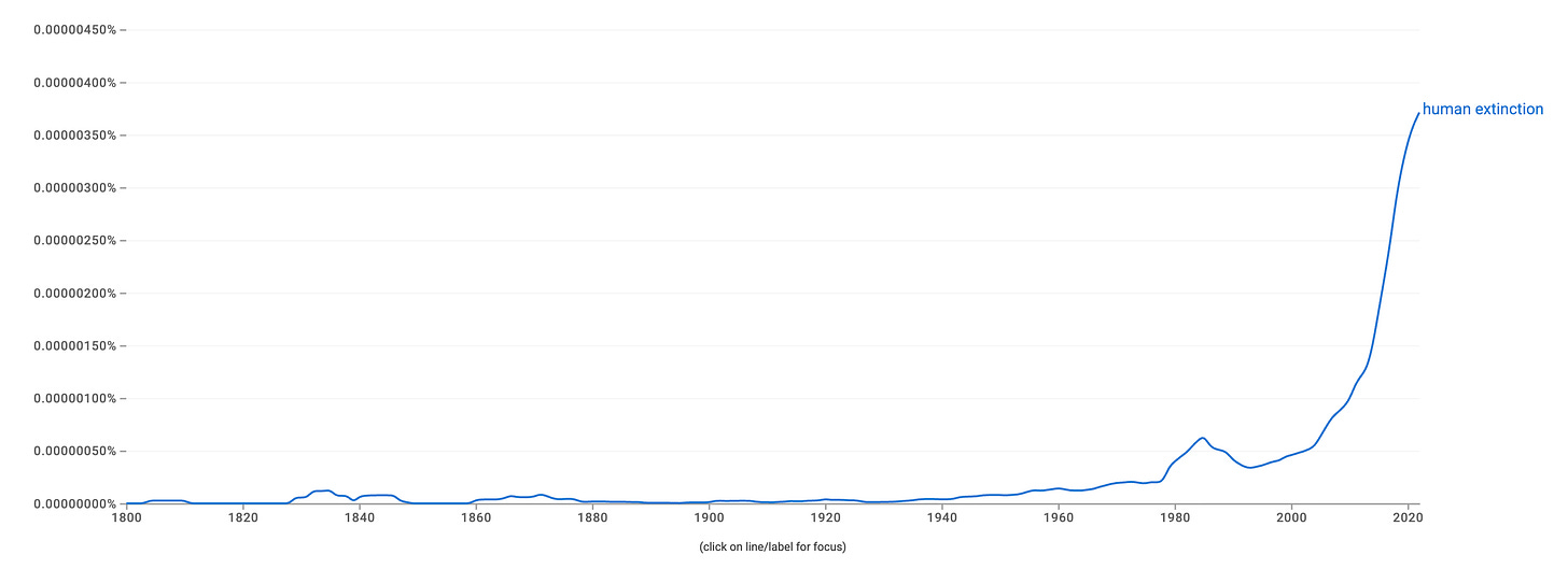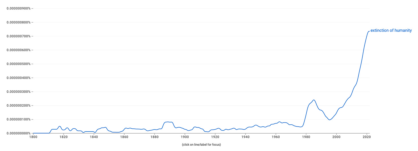 Or consider these Google Ngram Viewer graphs, which chart the frequency of the term “human extinction” over time within Google’s vast corpus of digitized texts:
