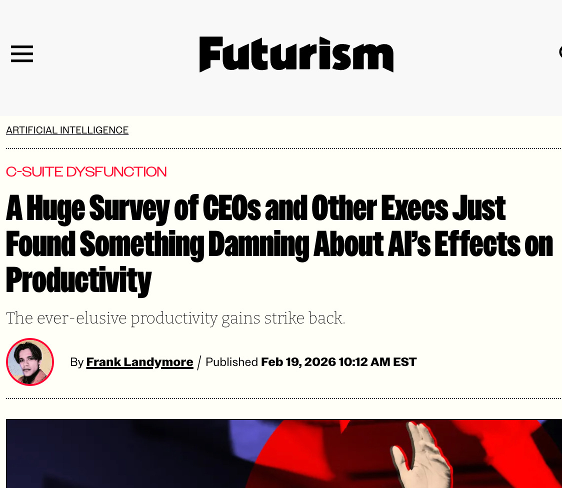 An even more recent study “published by the National Bureau of Economic Research” finds that “around 90 percent of the nearly 6,000 interviewed CEOs, chief financial officers, and other top executives at firms across the US, UK, Germany, and Australia, said that AI has had no impact on productivity or employment at their business.”