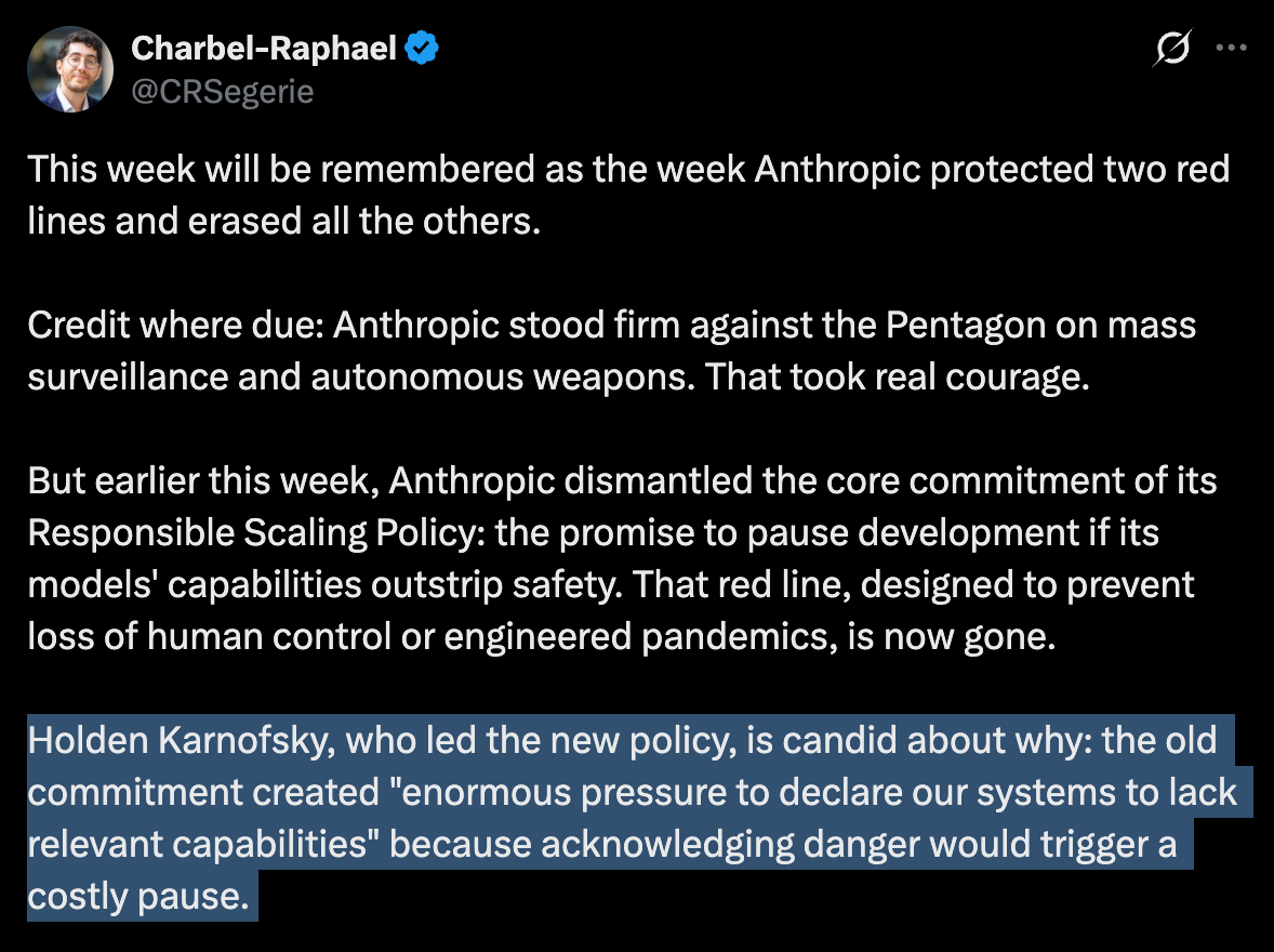 As it happens, Anthropic also reneged on a safety pledge once held up as evidence that it’s more ethically responsible than other AI companies. As TIME reports: