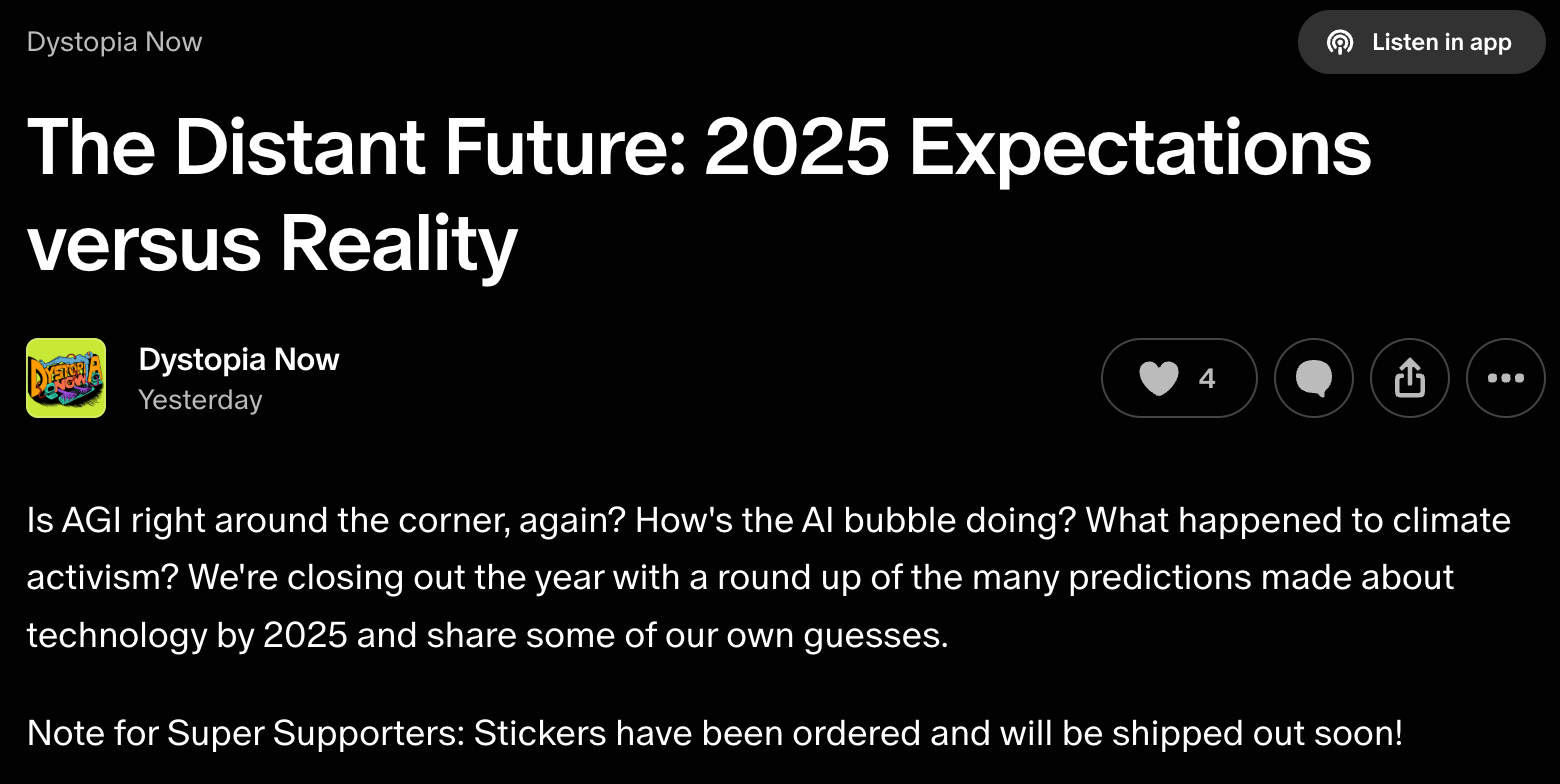 What isn’t paywalled is the latest — and last of the year — episode of Dystopia Now with me and comedian Kate Willett. We discuss some hilariously inaccurate predictions that people made about what would happen in or by 2025 — once again drawing from a newsletter article that you read here first!