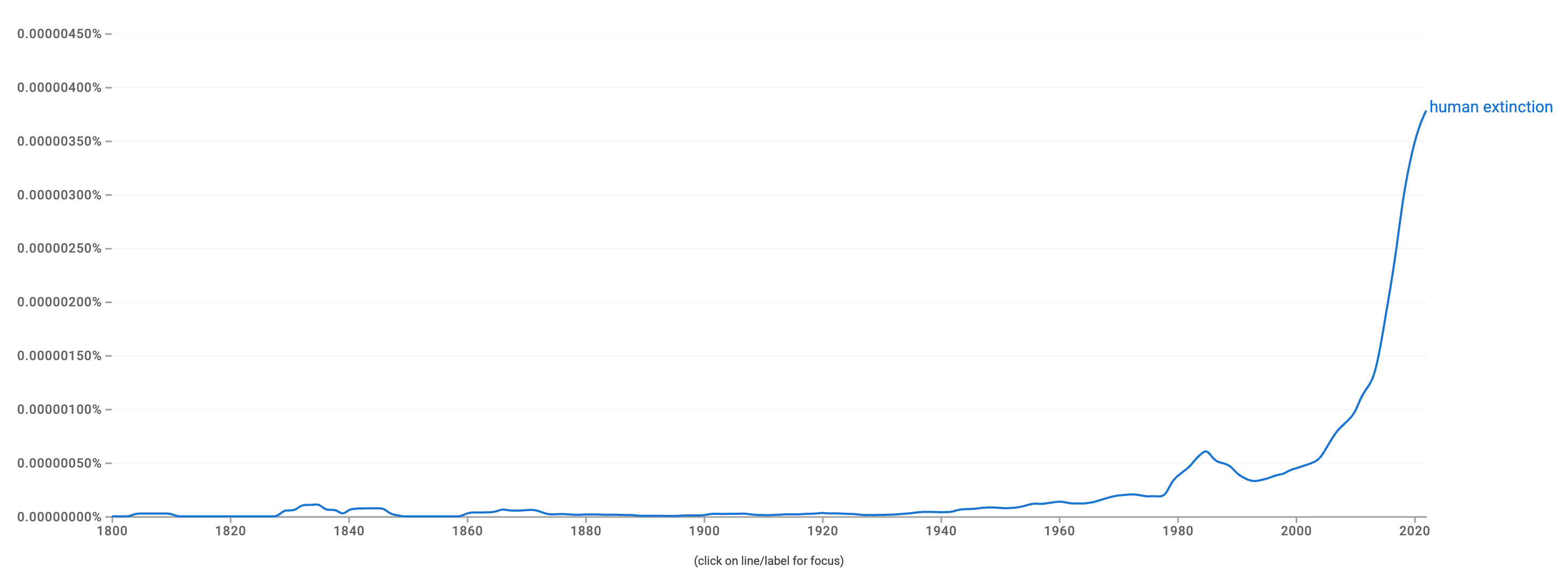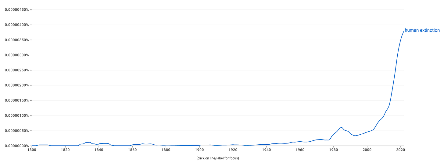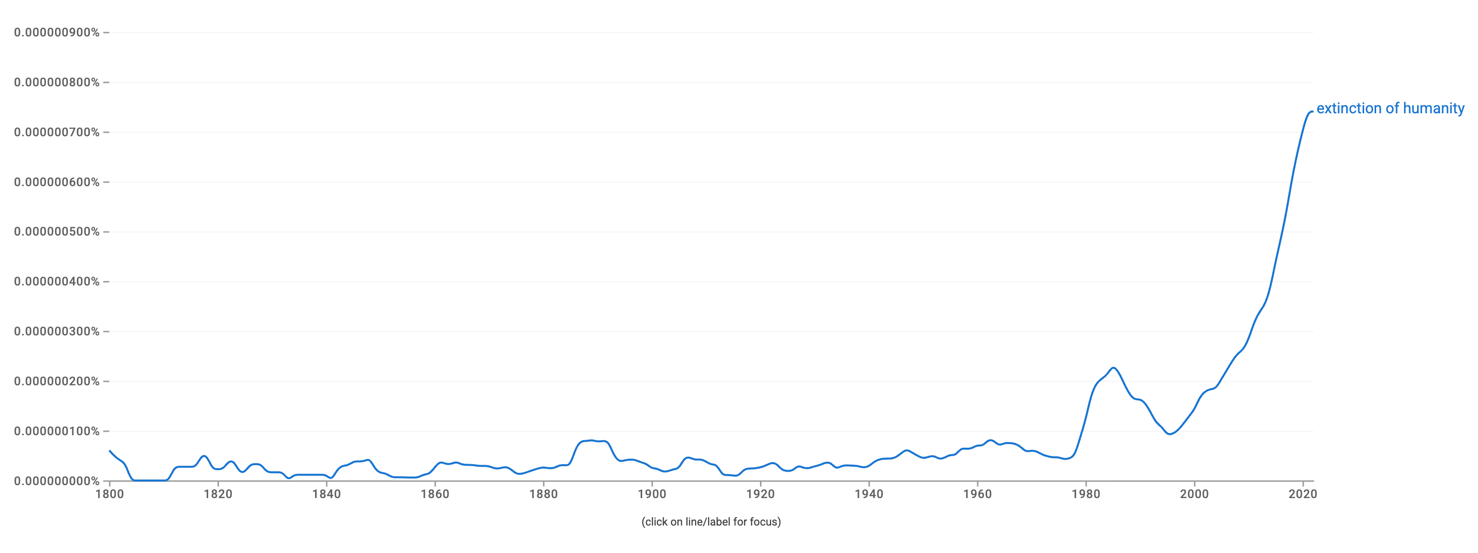 However, since the early 2000s, talk of human extinction has absolutely exploded. You can clearly see this in the Google Ngram Viewer results below, which track the frequency of terms like “human extinction” and “extinction of humanity” over time. The curve looks basically exponential, if not hyperbolic. Never before in human history — going all the way back to the ancient Greeks — has the topic of our extinction been more discussed and fretted over than it is right now. That makes the cultural-intellectual contours of our contemporary historical period genuinely unique!