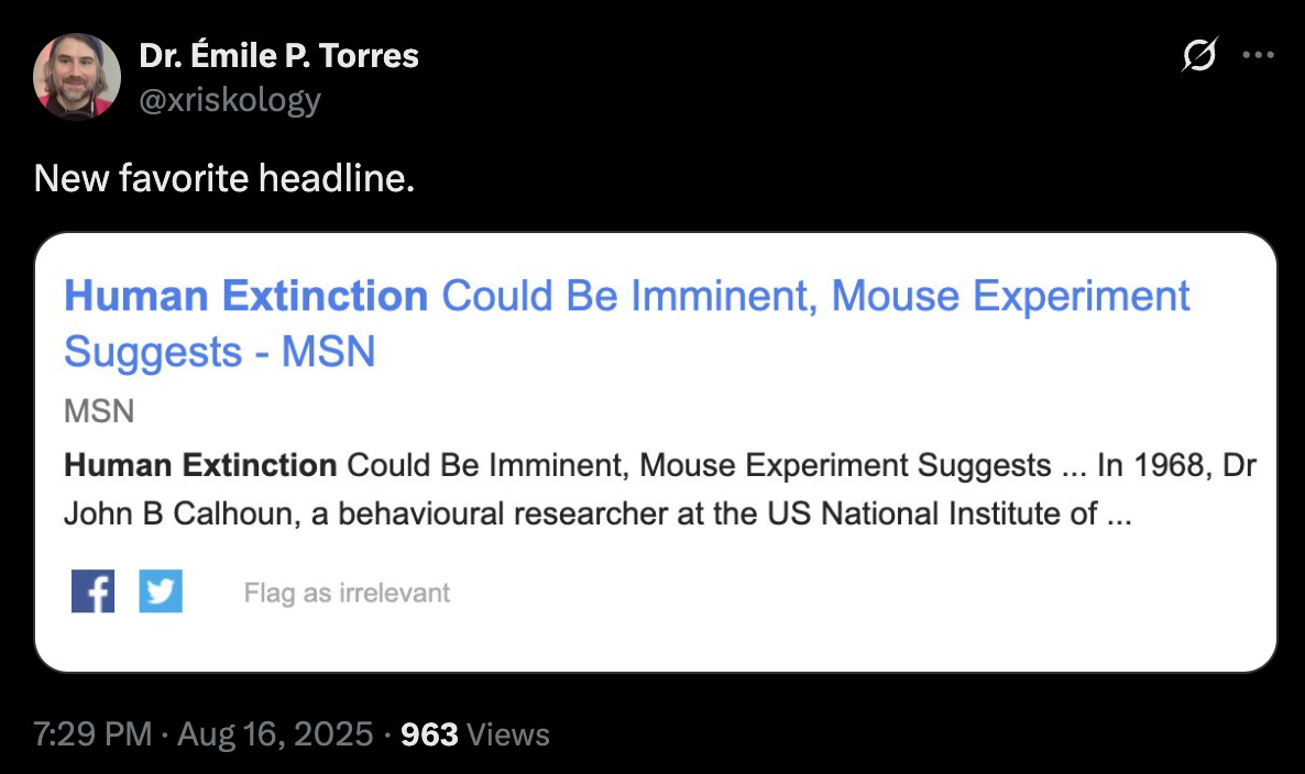 Ten years ago, during my TESCREAL phase, I would have vociferously rejected Tonn’s assessment, as I agreed with existential risk researchers like Nick Bostrom and Toby Ord that the probability of our extinction is quite high this century. Bostrom claims that there’s at least a 20% chance of extinction, while Ord estimates a 1-in-6 probability: the odds of Russian roulette.
