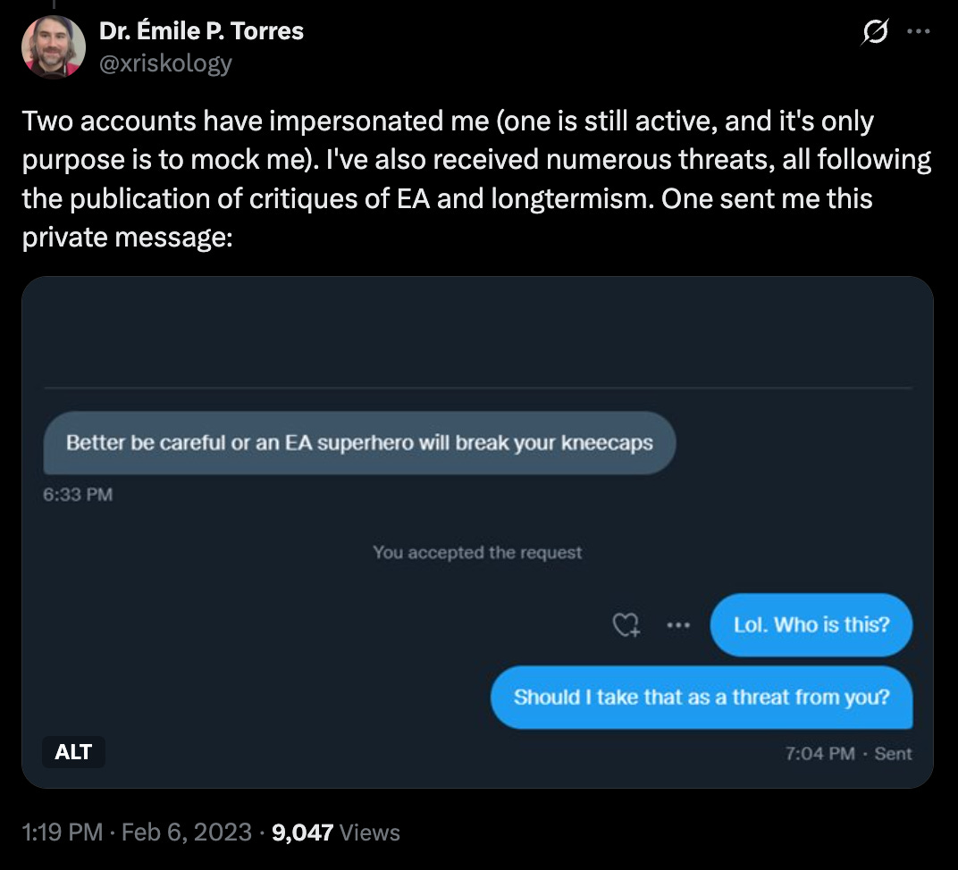 Almost immediately after I started publishing my critiques in 2022, I started to received threats of physical violence from the EA community. A large number of anonymous accounts on social media popped up for the sole purpose of harassing me and my friends. Some were banned by Twitter (before Musk took over) for bad behavior. Two accounts told me that an “EA superhero” would “kneecap” me, one of which later responded to me: “I wish you remained unborn 😭😭🙏🙏.”