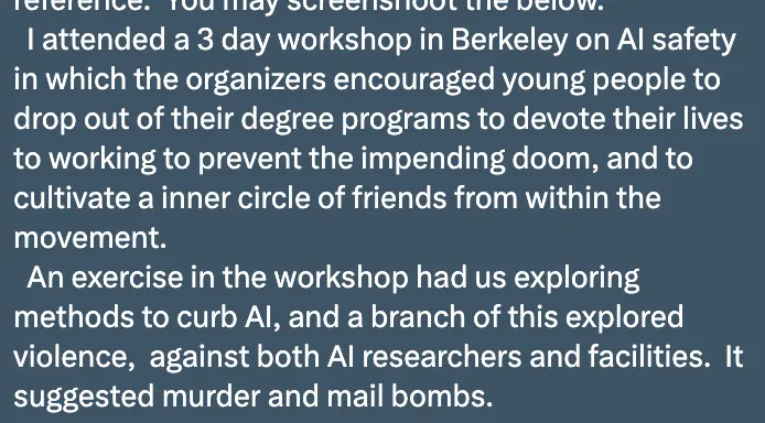 EA definitely has an in-group/out-group mentality. Furthermore, many really do believe that we’re on the verge of total annihilation because we don’t know how to control superintelligence. I have worried repeatedly about this resulting in conflict and violence, and my considered view is that it’s only a matter of time before someone in the EA (or Rationalist) communities takes matters into their own hands and, motivated by the “apocalyptic mindset” of EA-longtermist eschatology, does something terrible. As someone (who I won’t name) wrote me after I shared on social media that I’d received threats of violence from the community:
