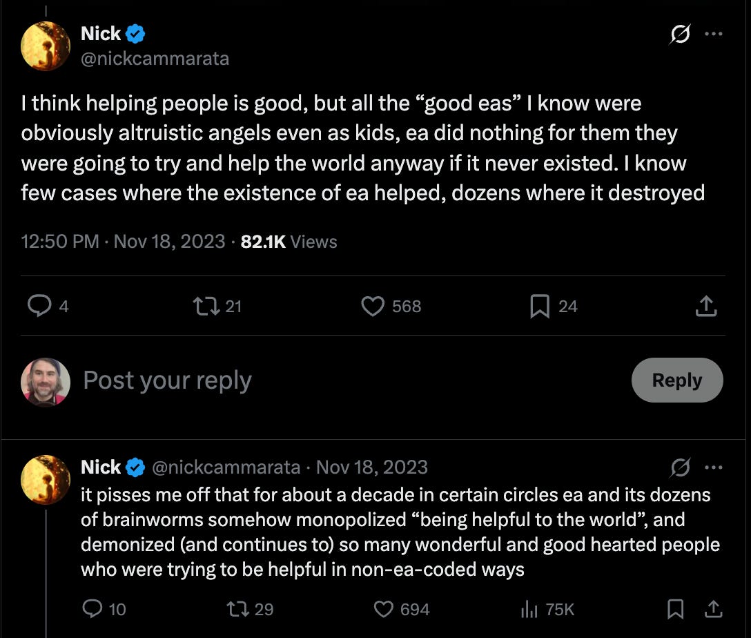 As I explain in this article for Truthdig, EA is actually far worse than traditional philanthropy for grassroots organizations, which has left many people in the Global South feeling even more hopeless than before. You might also check out the excellent book The Good It Promises, The Harm It Does for additional accounts of how EA has destroyed philanthropic endeavors, essentially making things much worse for those who aren’t in the cult of EA but want to help others as much as possible.