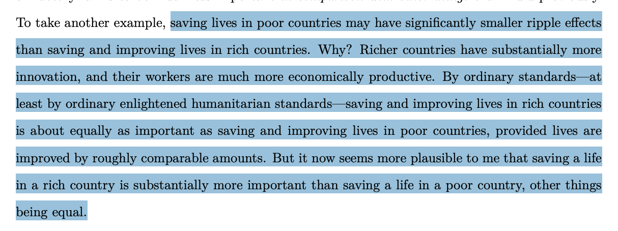 This is precisely why Nick Beckstead, a noted EA, argued in 2013 that, given the “overwhelming” moral importance of the far future — “millions, billions, and trillions” of years from now — we should prioritize saving the lives of people in rich countries over those in poor countries, other things being equal. The reason is that people in rich countries are better positioned to influence the far future.