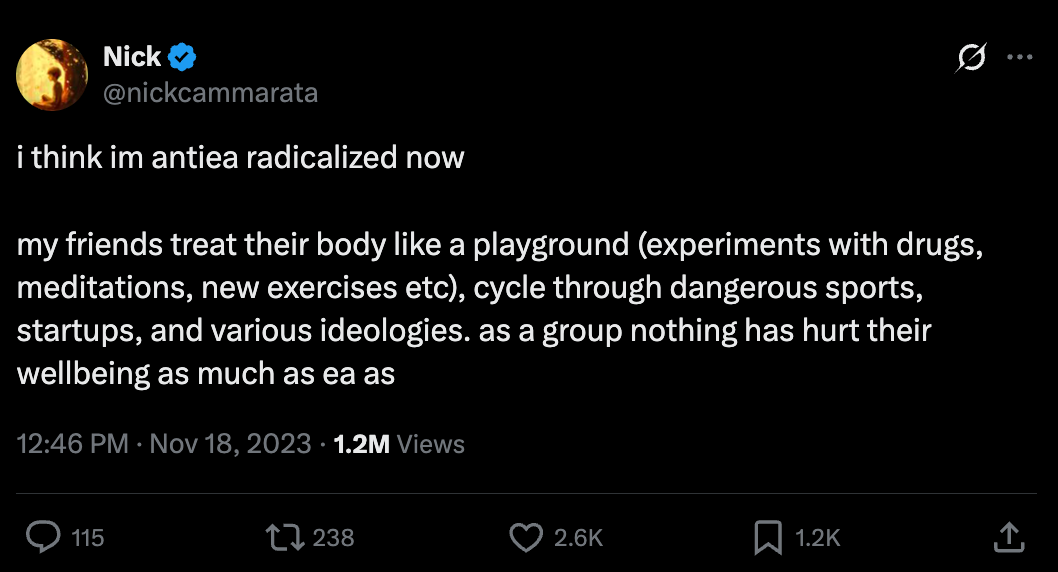 It was at this point that I became convinced that EA probably is a cult. Others began to notice as well. In late-2022, EA Forum user “nadavb” published an article titled “EA May Look Like a Cult (And It’s Not Just Optics).” It begins with this description of the community: