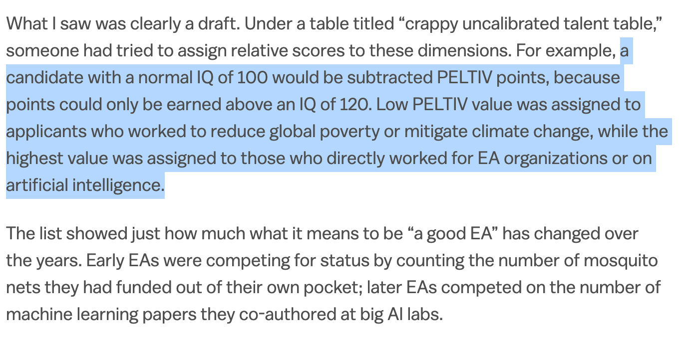 Just a few days before the Time article was published, Cremer — who was once an EA — wrote an article for Vox in which she revealed that CEA, the Centre for Effective Altruism, which shared office space with Bostrom’s FHI, had secretly tested an internal ranking system of EA members called “PELTIV.” Because the EA community is obsessed with IQ, people with IQs below 100 would have PELTIV points removed, while those with IQs above 120 would have them added.