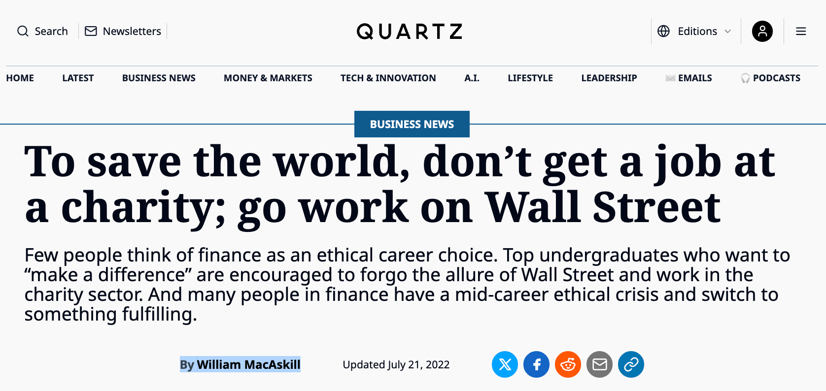 As noted, my opinion changed in late 2022, after I published a flurry of critiques of EA-longtermism in response to MacAskill’s 2022 book What We Owe the Future. This was just before the collapse of FTX, run by arguably the most famous EA-longtermist in the world: Sam Bankman-Fried. MacAskill went on a media blitz, and received a great deal of positive coverage. Much of what he said and wrote during this time rubbed me the wrong way, as I saw it as dishonest and misleading. It was, in my opinion, nothing more than propaganda for an ideology that I considered to be profoundly dangerous, for reasons outlined in my Aeon article from 2021. As one of the only former insiders who became publicly critical of EA, I felt a moral duty to speak out.