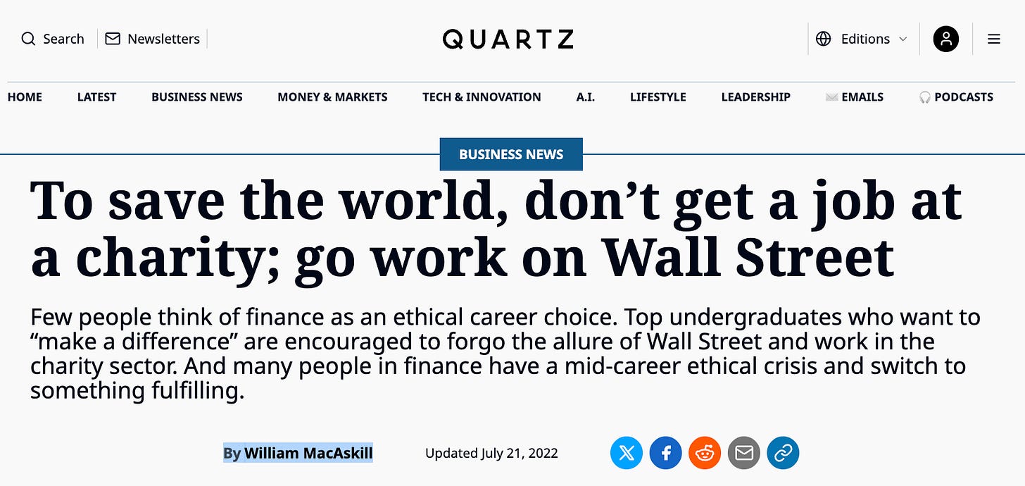 All of this is true. For example, according to the EA career-advice organization 80,000 Hours, among the top 10 “highest-impact career paths” is “helping build the effective altruism community” (!!). One way of doing this is by “earning to give,” whereby one pursues the most lucrative job possible to give more money to EA-approved charities and the EA community itself. This is precisely what MacAskill convinced Bankman-Fried to do in the early 2010s, which is why Bankman-Fried landed a job on Wall Street and then went into crypto. According to MacAskill, there is nothing morally wrong with working for what he calls “immoral organizations,” such as Wall Street firms and petrochemical companies — so long as one then donates one’s extra money toward “saving the world” (another phrase EAs use), you’ll be doing what’s right — even, what’s obligatory — from a utilitarian-esque perspective.