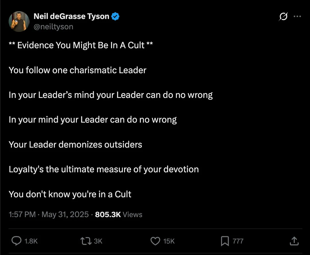 I don’t know much about a website called “Cult Recovery 101” (seems legit), but it includes a useful list of characteristics of a cult. Let’s take a look at these characteristics (quoted in bold as bullet points), commenting on each in turn: