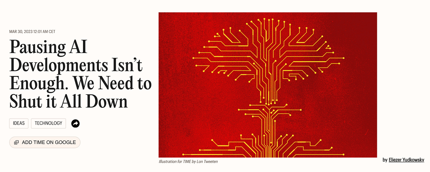 Consequently, Yudkowsky has started to adopt a position strikingly similar to Joy’s: the only feasible option right now is to shut it all down, as Yudkowsky argued in a 2023 article in TIME magazine. Whereas in 2008 he was claiming that “a restrictive global treaty” would be “difficult to enforce” — it is, essentially, a nonstarter — by 2023 he’s explicitly arguing for a global treaty to prevent any company anywhere on Earth from developing ASI within the foreseeable future.3