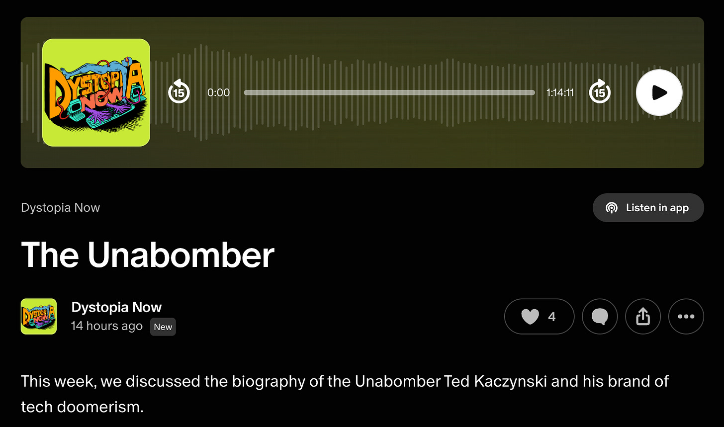Incidentally, Kaczynski’s short essay “Ship of Fools” reminds me so much of Yudkowsky’s writing. It’s a fictional tale of a ship that’s heading into the Arctic. People on the ship bicker about social justice issues, which distract them from a lone voice screaming that none of that matters because everyone will soon be dead. That echoes, almost exactly, Yudkowsky’s remarks about how social justice is a non-issue given the imminent threat of ASI. See this section of a previous newsletter article for details. Honestly, “Ship of Fools” could very well have been written by Yudkowsky — it’s that close to Yudkowsky’s thinking and preferred way of communicating (through fictional stories).