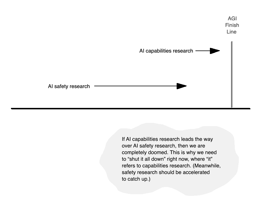 Here’s what I would add: Kaczynski saw humanity as confronting an apocalyptic moment in which the only option to save humanity from existentially disastrous technology is to overthrow the reigning paradigm — industrial society. Yudkowsky similarly argues that we’re in an apocalyptic moment where the only option left is to overthrow the current configuration of our technological milieu, whereby AI capabilities research is racing toward the ASI finish line much faster than AI safety research. Something radical and drastic has to change, now.