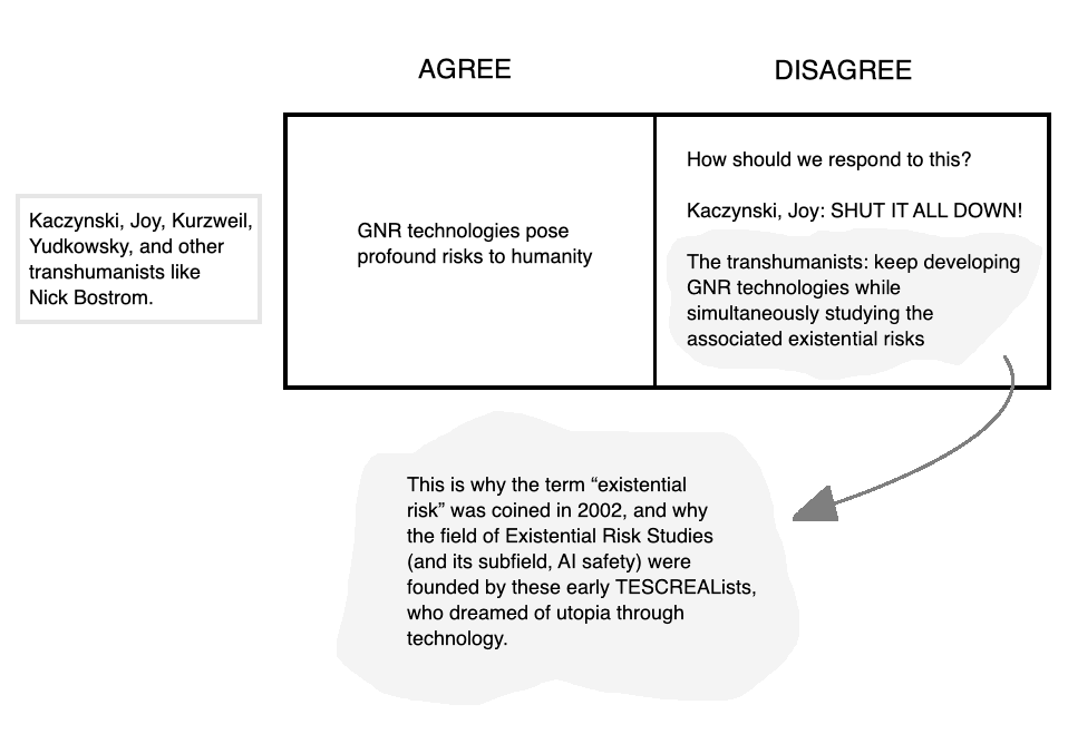 Consequently, these transhumanists proposed an alternative response to what everyone agreed about: that GNR technologies are existentially risky. Instead of relinquishing entire domains of science and technology, we should instead found a new field dedicated to studying the associated risks with the goal of neutralizing them — so we can keep our technological cake and eat it, too.
