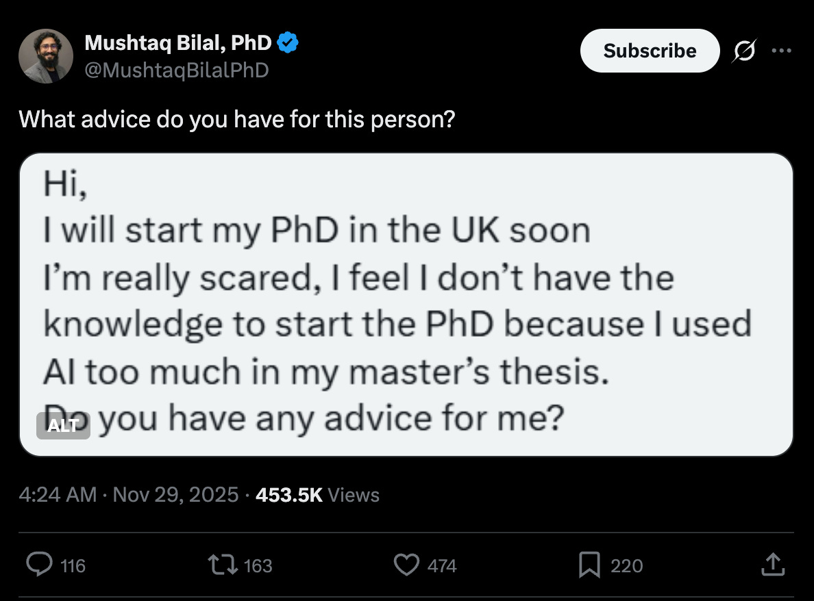 What a sad state of affairs! I am genuinely quite worried about the long-term consequences of students cognitively offloading critical thinking skills to deceptively dumb LLMs. If there’s one skill that students should leave their time at university with, it’s the ability to critically analyze ideas, claims, arguments, hypotheses, perspectives, etc. I’m reminded of this tweet from late last month: