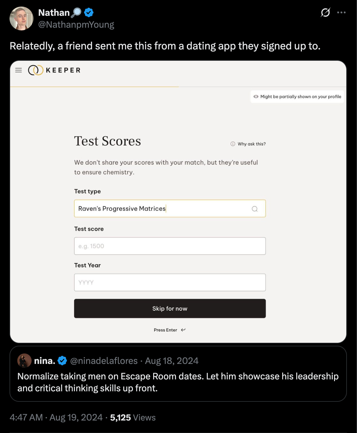 Someone else in the TESCREAL community, Nathan Young, noted last year that “a friend sent me this from a dating app they signed up to.” The app includes a request for one’s IQ: