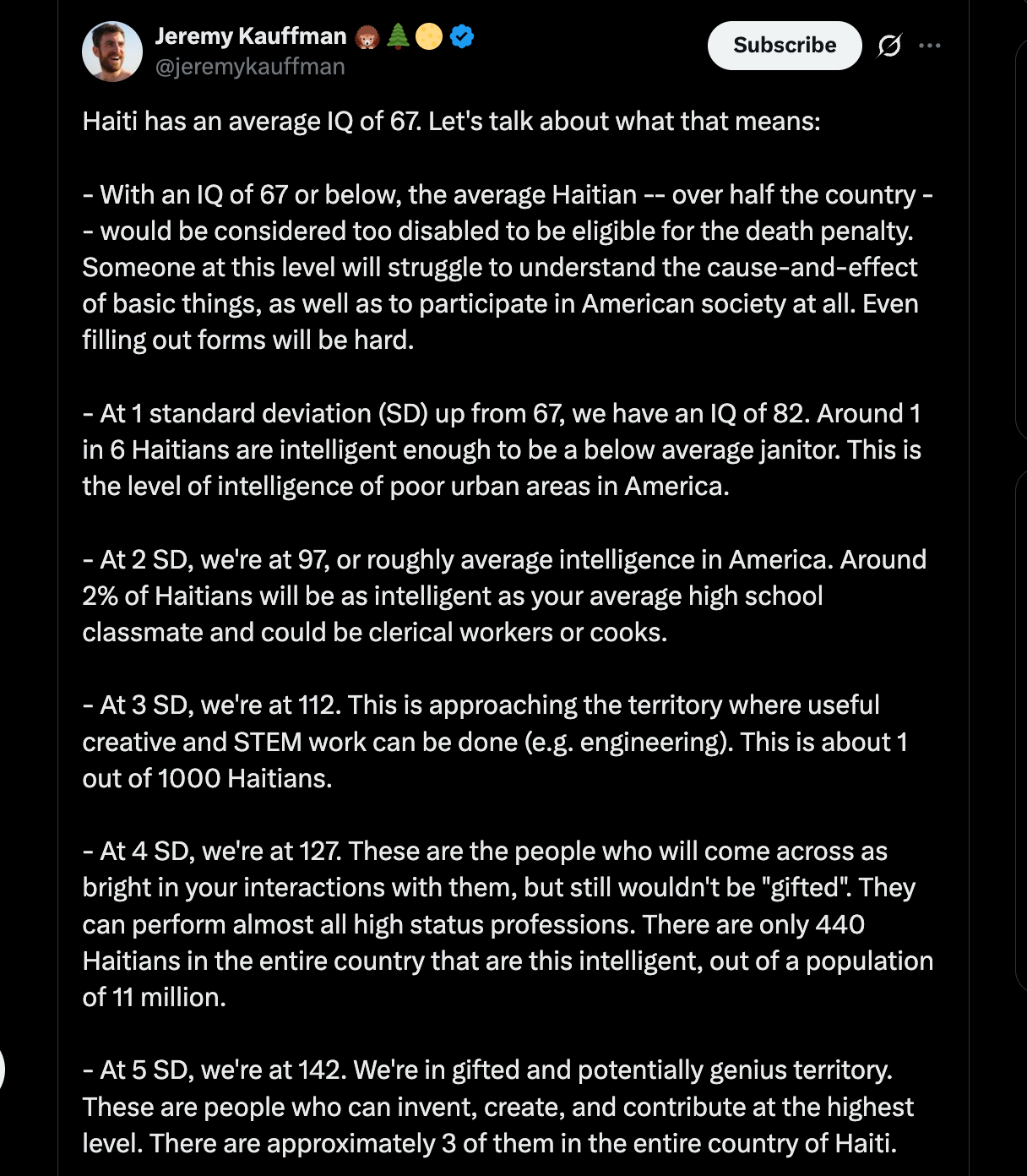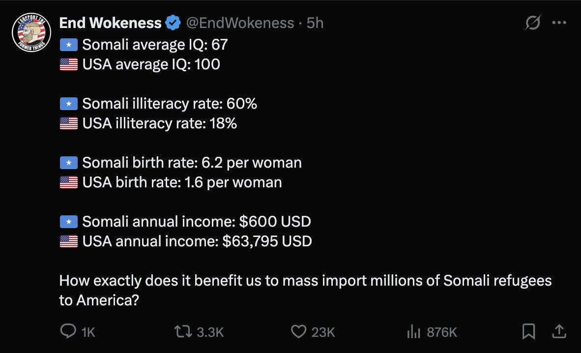And, of course, there are far-right figures like “End Wokeness” that have taken up and promoted the eugenic notion that IQ is a meaningful measure of “intelligence” and that we should be concerned about people from “low-IQ” countries immigrating to the US: