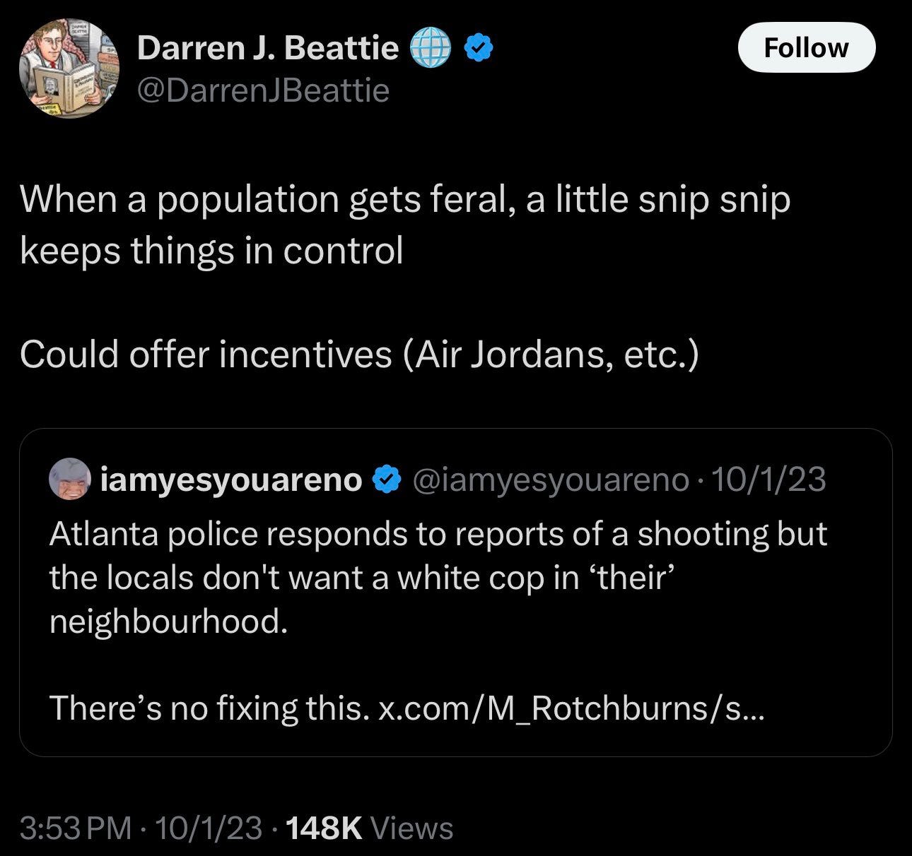 Finally, here’s Darren Beattie, the current Senior Bureau Official in Public Diplomacy in Trump’s State Department, saying that “when a population gets feral, a little snip snip keeps things in control,” to which he adds that you could incentivize Black people to get vasectomies by offering them “Air Jordans.” F*cking hell: