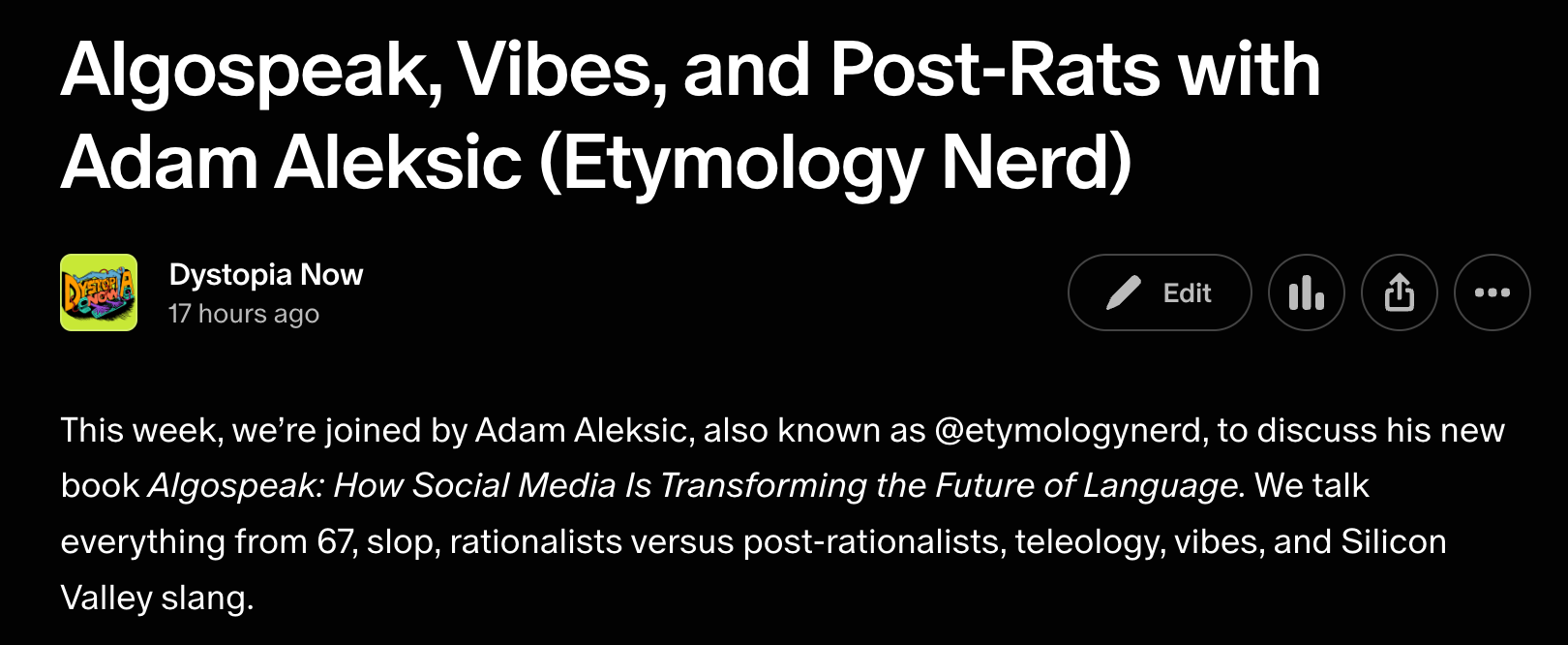 First, I want to share the most recent episode of my podcast Dystopia Now. The comedian Kate Willett and I interview the brilliant young linguist Adam Aleksic, better known on TikTok and YouTube as Etymology Nerd. Adam just published a fantastic book titled Algospeak.
