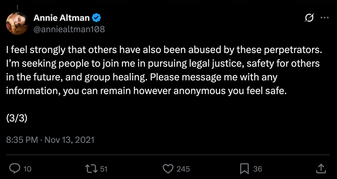 Annie adds: “I feel strongly that others have also been abused by these perpetrators. I’m seeking people to join me in pursuing legal justice, safety for others in the future, and group healing. Please message me with any information, you can remain however anonymous you feel safe.” In January of this year, Annie filed a lawsuit against Sam “claiming he sexually abused her.”