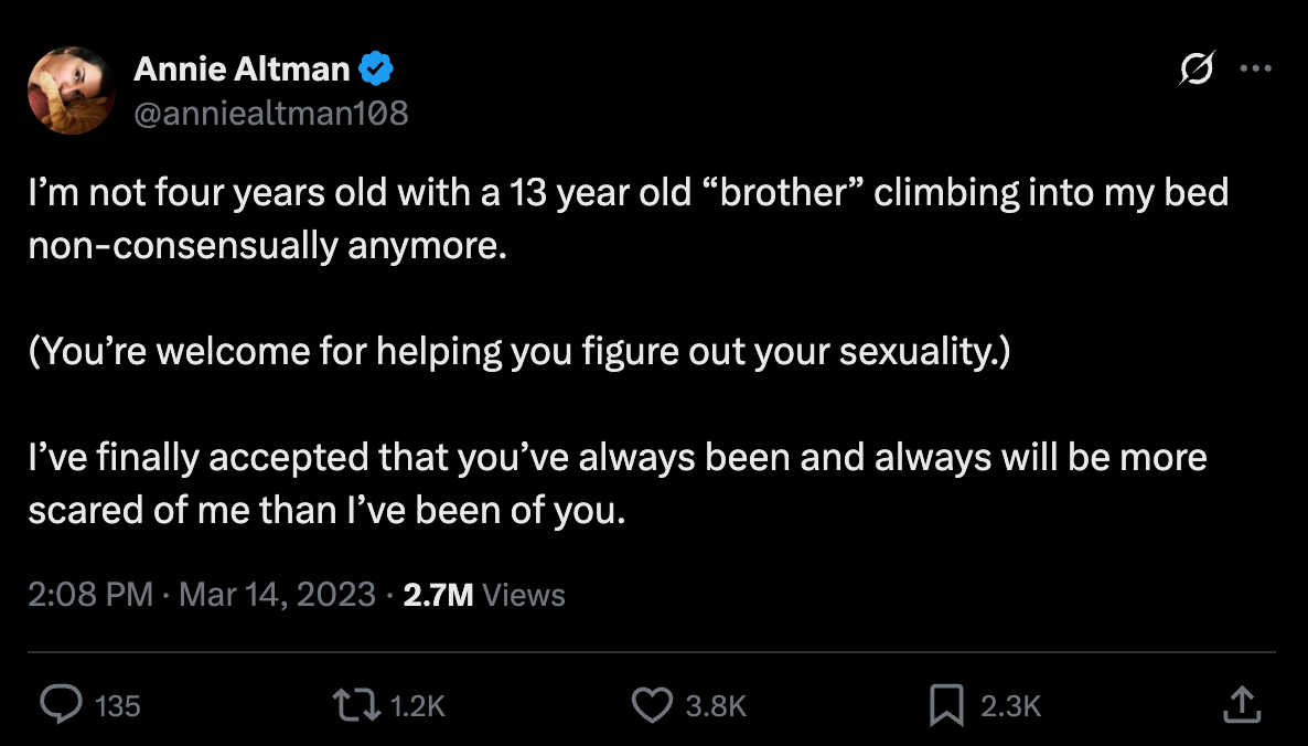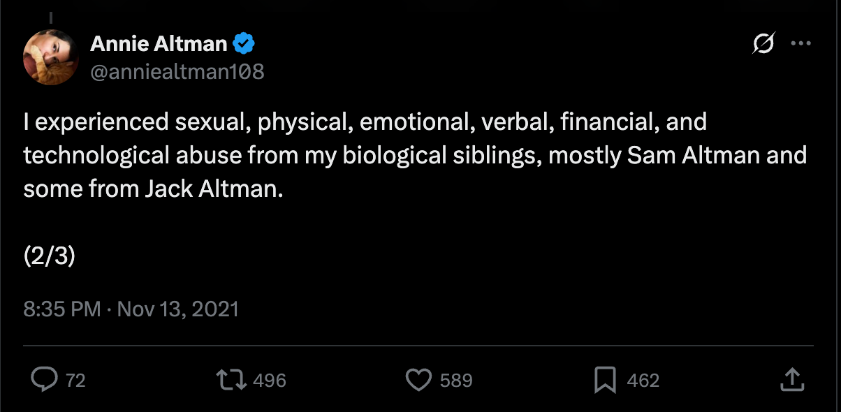 Even Altman’s sister, Annie Altman, has repeatedly accused Sam of abusive behavior. “I experienced sexual, physical, emotional, verbal, financial, and technological abuse from my biological siblings, mostly Sam Altman and some from Jack Altman,” she writes.