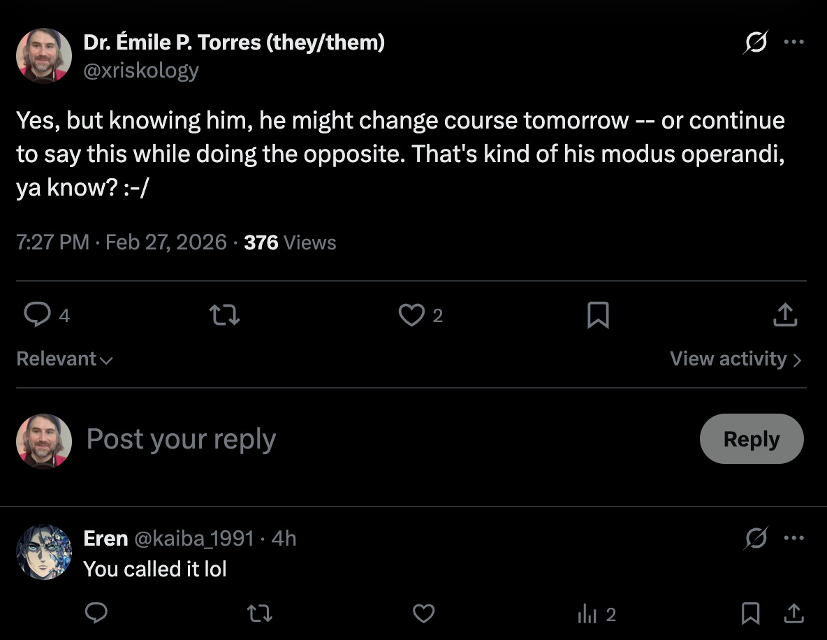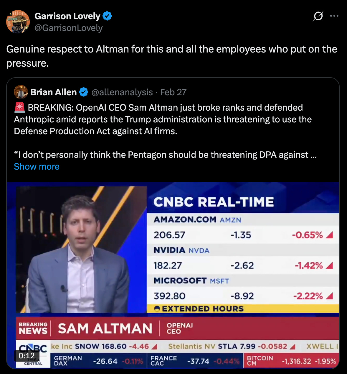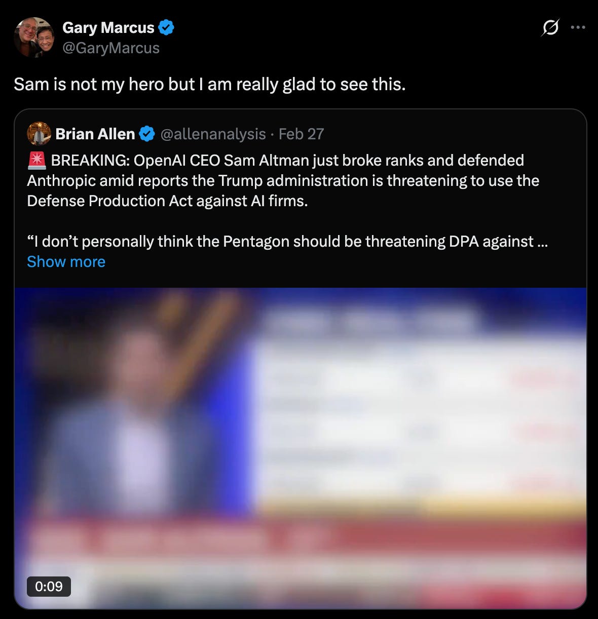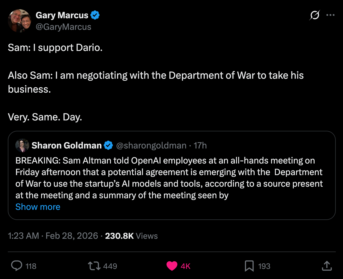 Altman is a god damn liar. He says whatever the hell he needs to say to retain and acquire power. He has absolutely zero allegiance to the truth. I know this, which is why I didn’t believe a word Altman said when he expressed support for Anthropic in its battle with the Pentagon.
