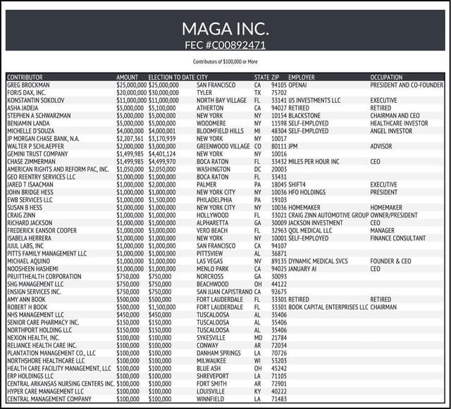 As Marcus alluded to in one of his tweets, Brockman is the #1 donor to Trump’s Super PAC called MAGA INC. Take a look at the name at the very top.