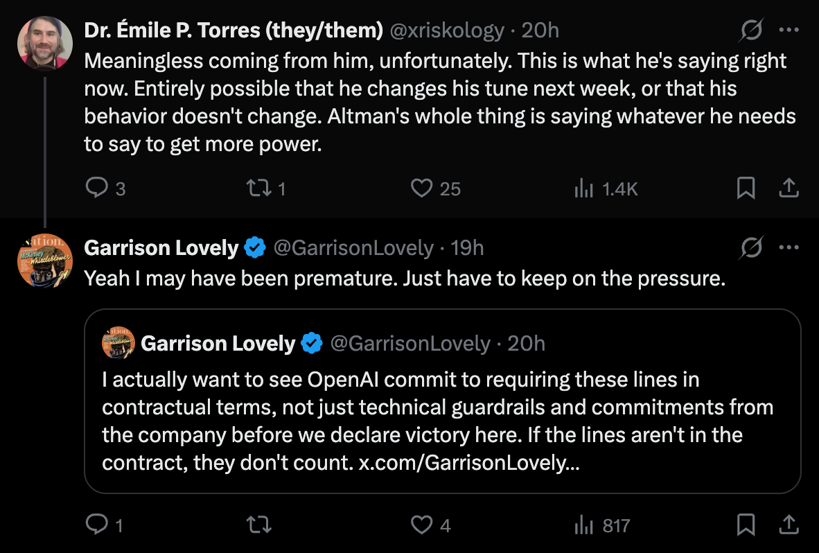 OpenAI is a-okay with the Pentagon mass surveilling Americans and putting constantly hallucinating, reliably unreliable AI systems entirely in charge of lethal weapons. The situation is appalling. The Doomsday Clock would have ticked forward to 70 seconds before doom if its setting had been announced a month later than it was.