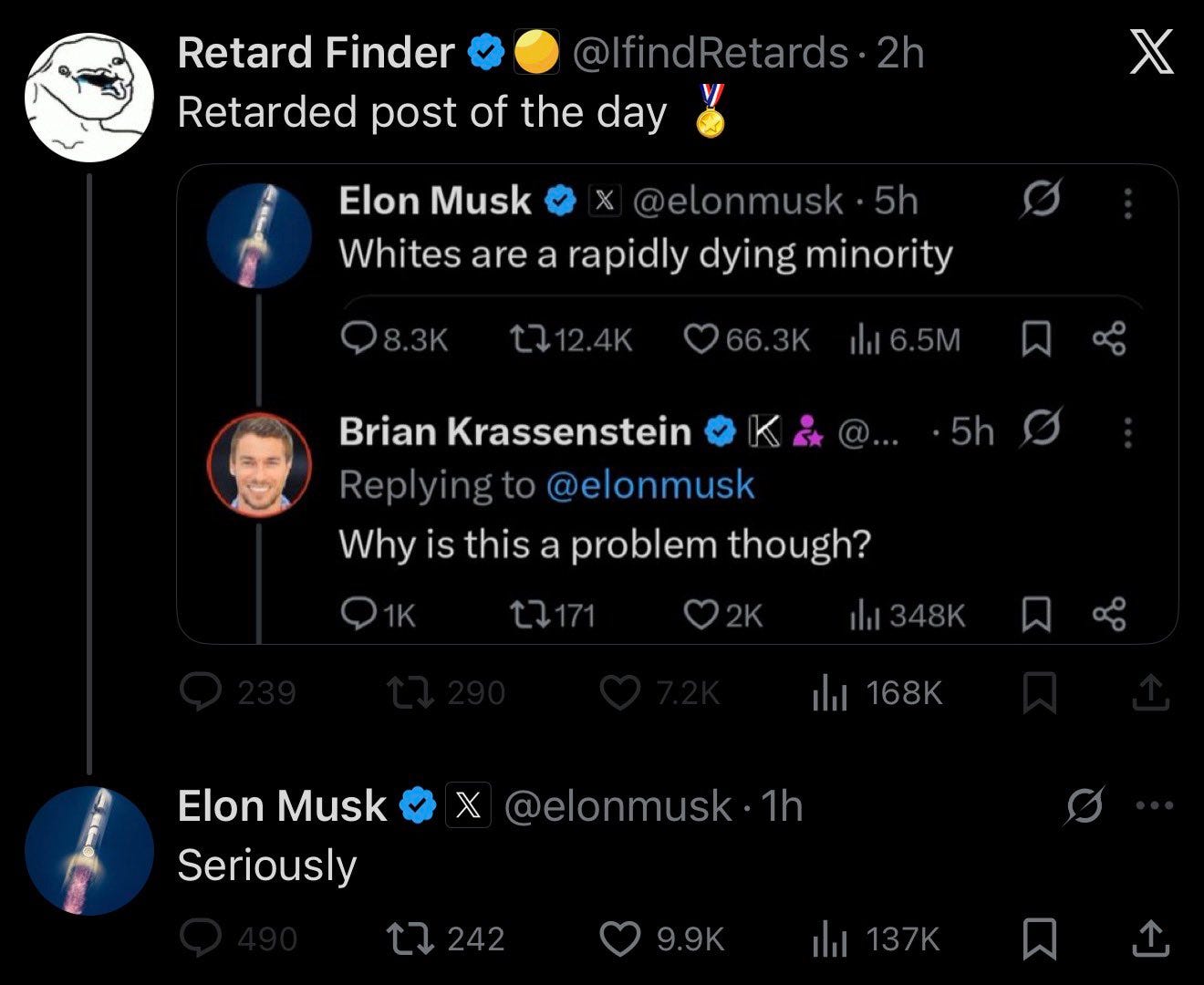 We all know that Elon Musk is a white supremacist. But the past month or so has shown he’s increasingly comfortable with blatant expressions of this noxious ideology. The other day, he posted this: