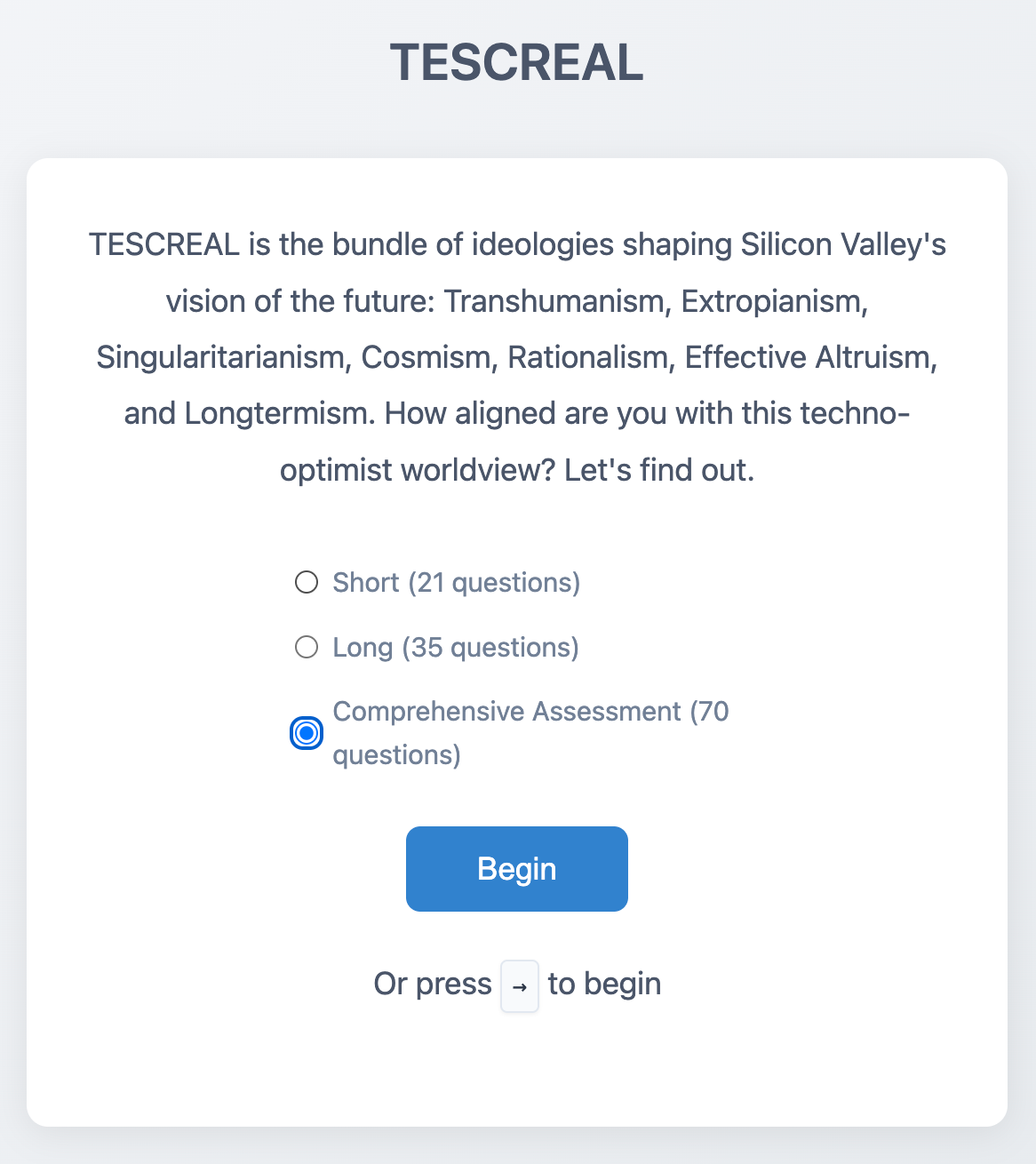 The other day, Timnit Gebru sent me a link to a survey that attempts to assess how TESCREAL one is. It’s quite amusing: