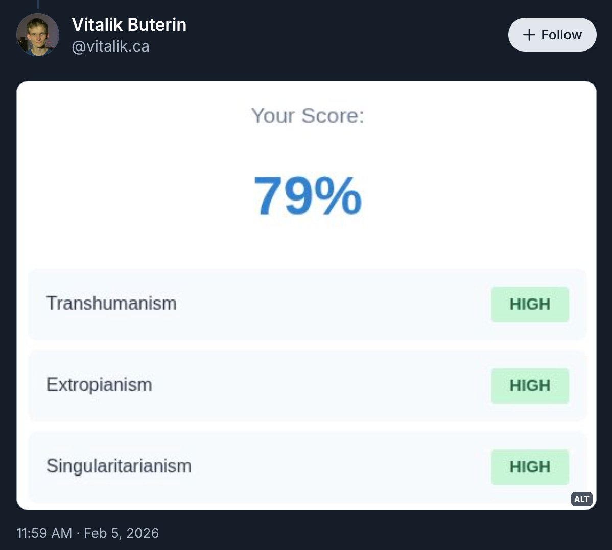 Vitalik Buterin, who won a Thiel Fellowship and cofounded Etherium, also shared his score on Bluesky. Buterin is a major funder of the TESCREAL movement — e.g., he recently donated $660 million to the TESCREAL-aligned Future of Life Institute.