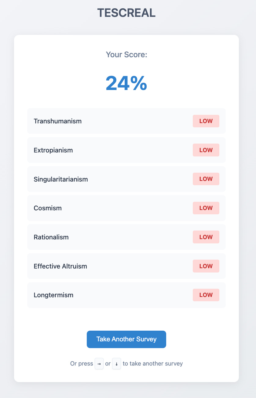 Scored 13%. Which… yeah. Although my mood was, at the time, very anti-TESCREAL at the moment.