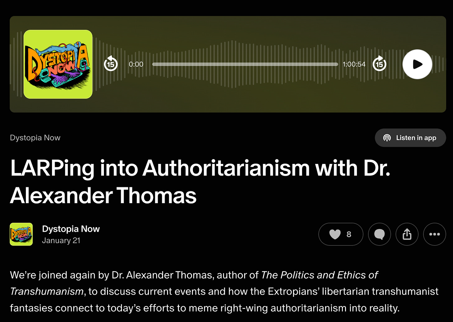 Finally, I keep forgetting to promote new episodes of my podcast Dystopia Now. Here is, once again, a recent discussion with my friend Dr. Alexander Thomas. I really enjoyed our chat, gloomy as it was, and think you might, too: