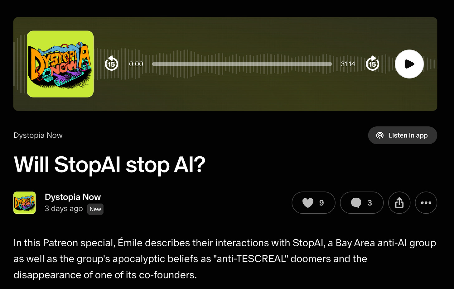 We also recorded a subscription-only episode on Stop AI, after one of it’s members defected and appeared to threaten violence against AI companies. This happened last November, and immediately afterwards, the individual in question disappeared. He is still missing as of this writing.