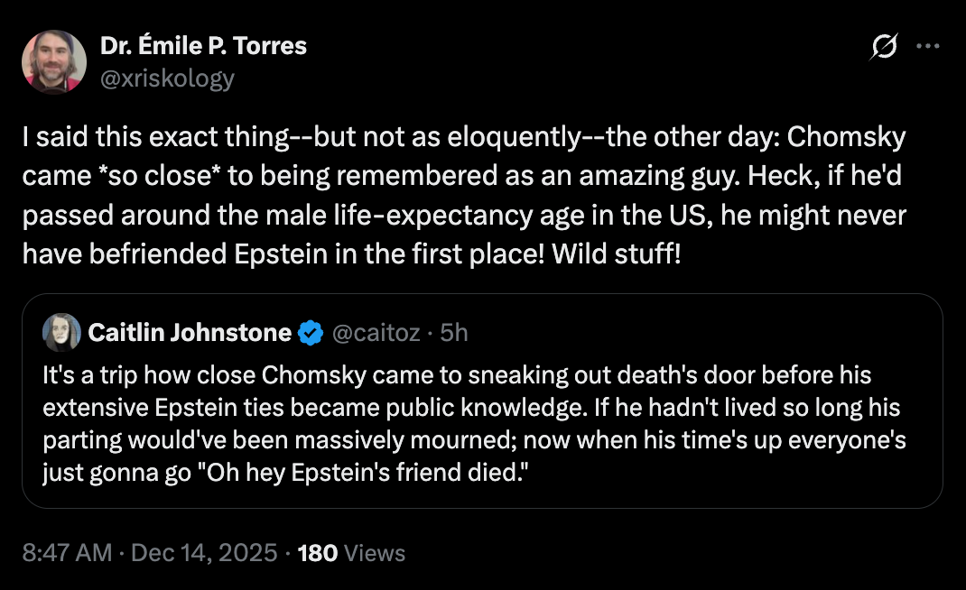 For all the good he’s done in the world, Chomsky is a man of incredibly poor judgment and low moral standards — at least in his personal life. I can’t avoid the conclusion that this will seriously tarnish his legacy, as it should. Perhaps somewhat insolently, I actually brought this up during our email exchange in 2019. He did not express any concerns — again, terrible judgment on his part.