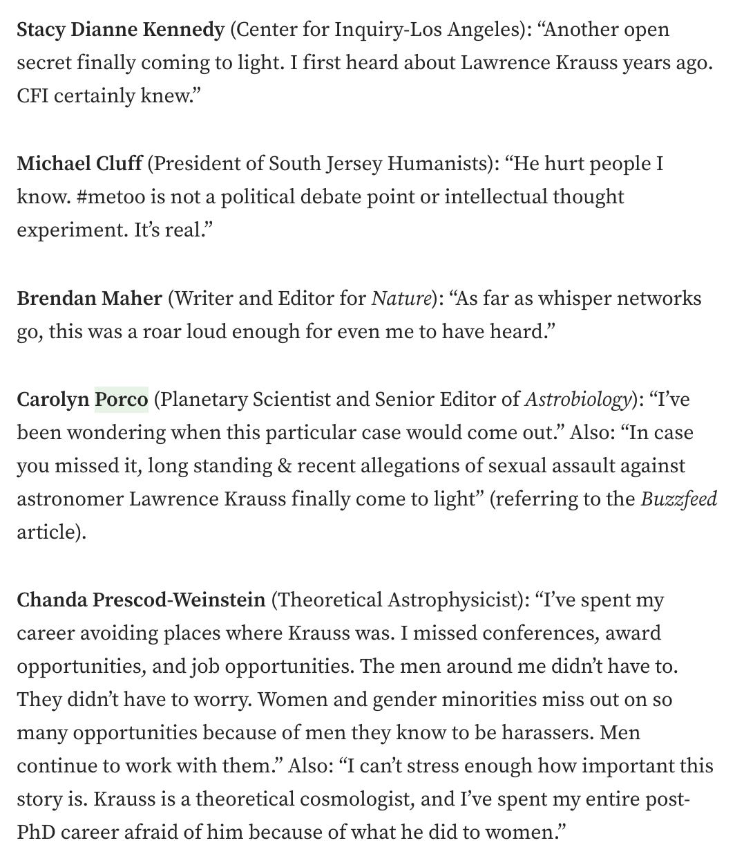 He can’t comment on the experience of my friend (which I mentioned to him). He’s read the charges of sexual misconduct made against Krauss, as well as Krauss’ response to those charges, and he found Krauss’ response compelling. He then adds that he knows people, including some women, who’ve worked with Krauss and never heard anything about a whisper network surrounding the guy. [So freaking what??] He concludes by saying that his decision to continue being friends with and supporting Krauss is made on the basis of the evidence available to him, which suggests that Krauss is innocent.2