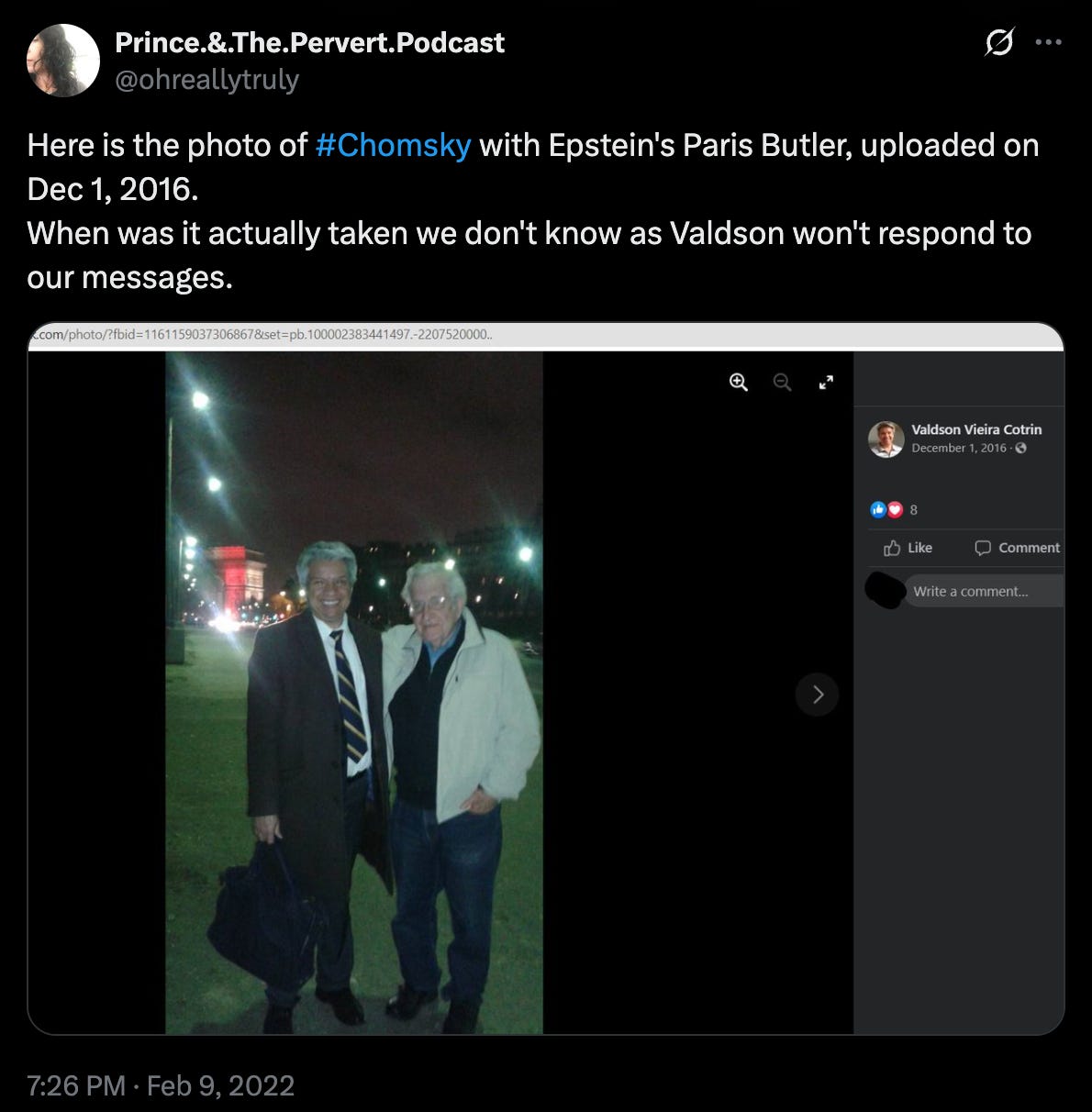As discussed in the video below (beginning around 3:00), a photograph surfaced in 2022 of Chomsky with Epstein’s butler in Paris, which was apparently taken close to Epstein’s apartment in Paris. Why was Chomsky hanging out with Epstein’s butler?