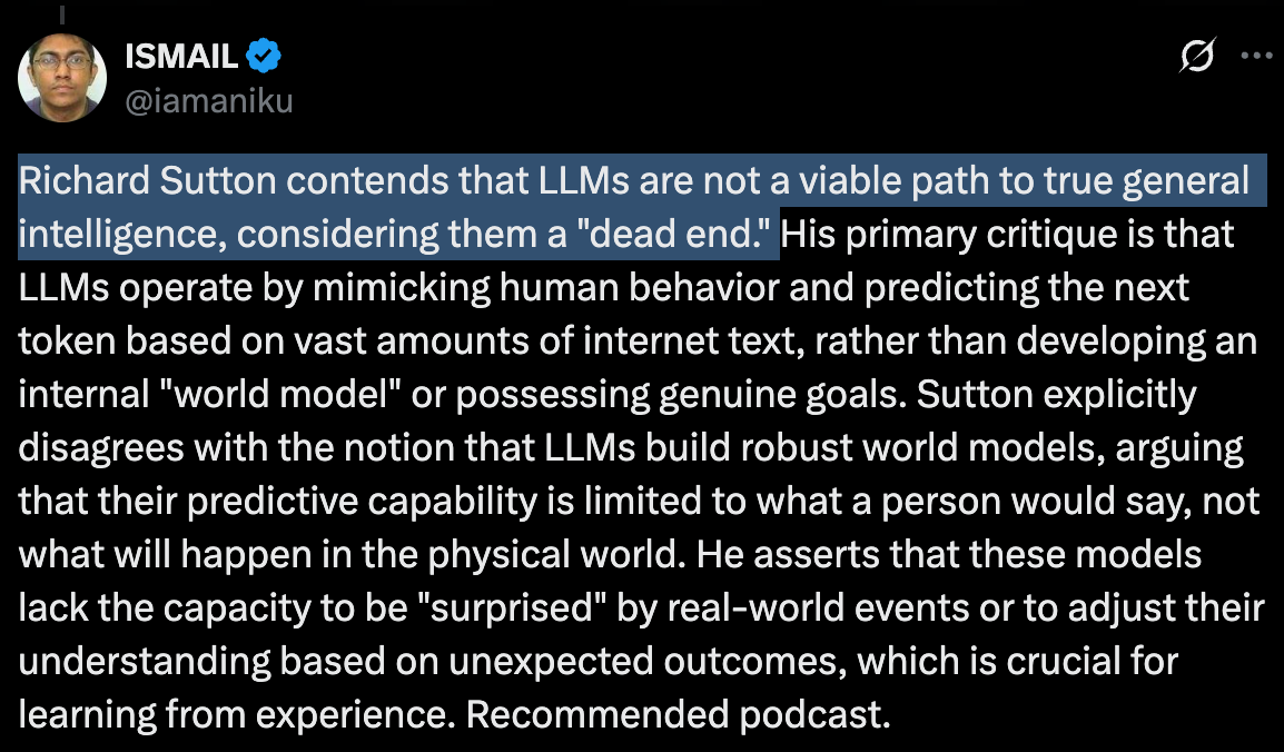 Even Richard Sutton, an anti-democracy pro-extinctionist who won the Turing Award last year for his contributions to reinforcement learning, now “contends that LLMs are not a viable path to true general intelligence.” He concedes that they are a “dead end.”