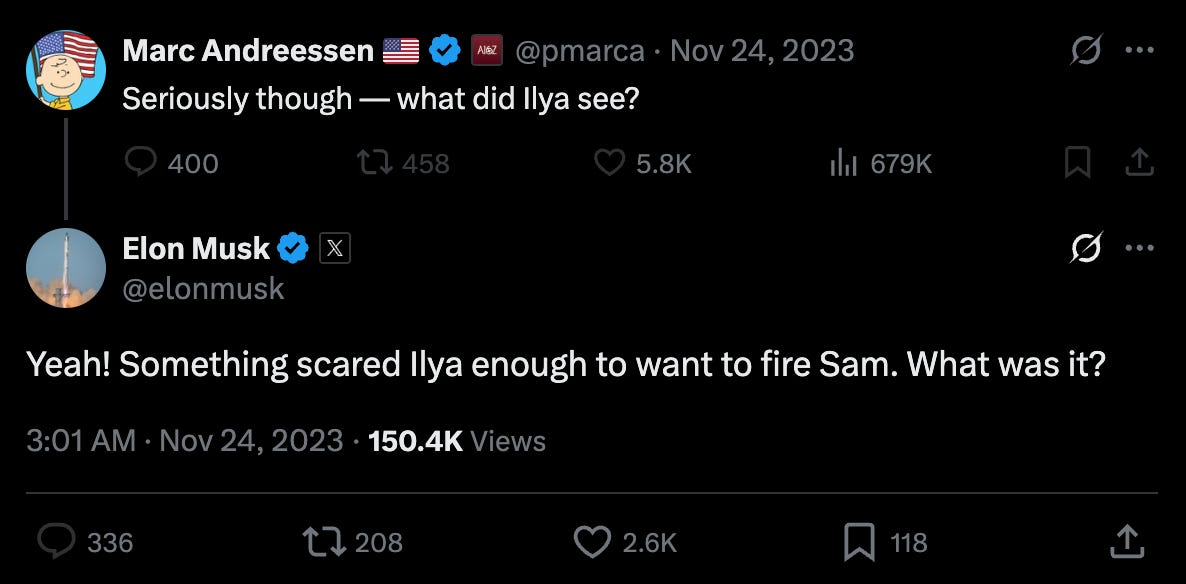 On X, the TESCREAList Marc Andreessen wrote in November 2023: “Seriously though — what did Ilya see?” Elon Musk responded: “Yeah! Something scared Ilya enough to want to fire Sam. What was it?”