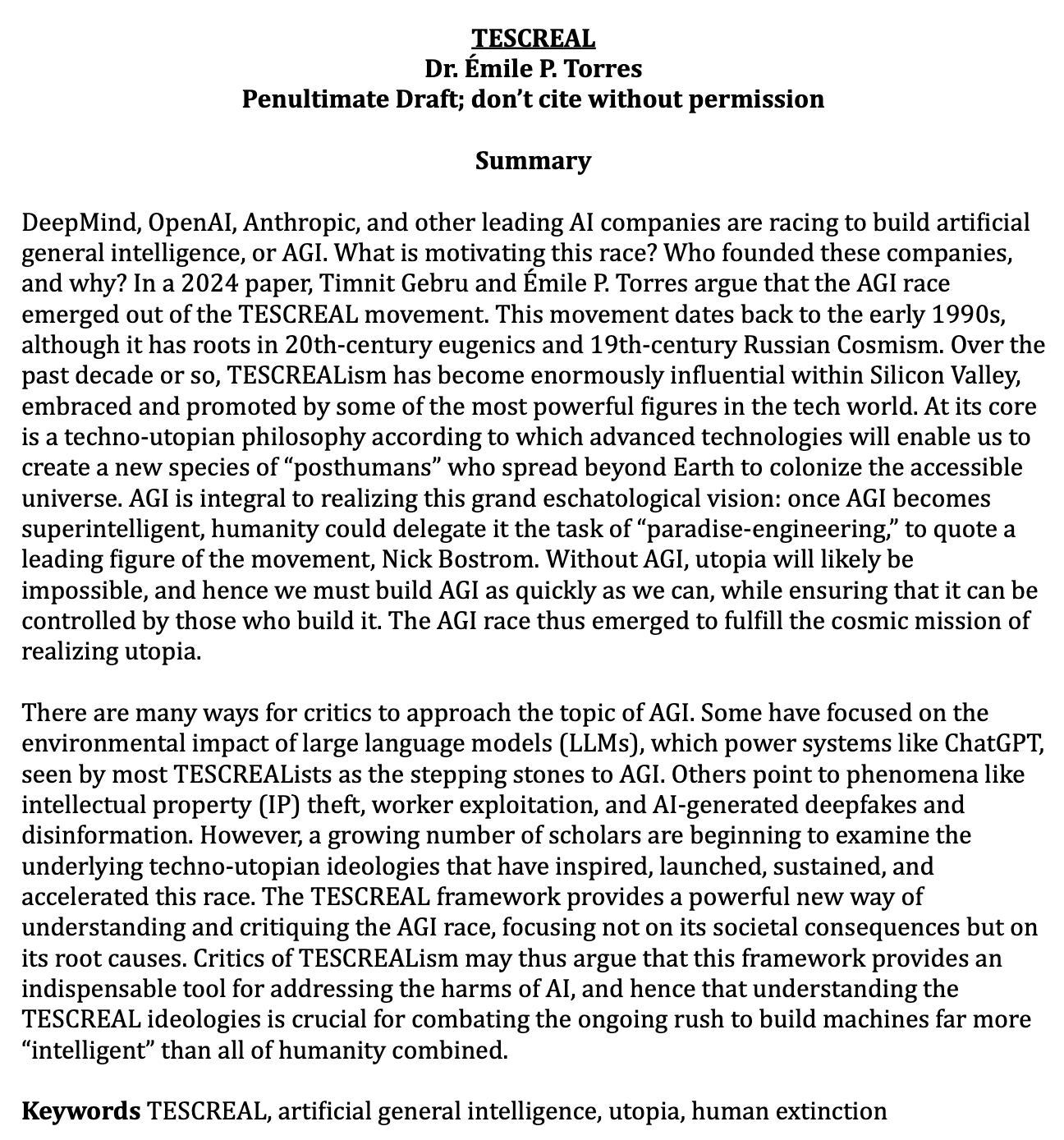 I’m happy to say that I just submitted a final draft of my article (somewhat boringly) titled “TESCREAL” to the Oxford Research Encyclopedia of Science, Technology, and Society. It’s very long — about 16,000 words — but it’s also very detailed and comprehensive. If you’d like to look over a penultimate draft, you can do so here.