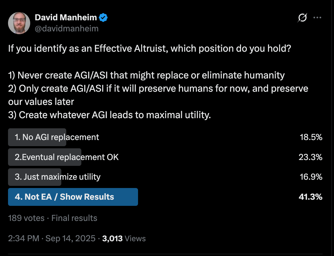 David Manheim, an active participant in the TESCREAL movement, posted a poll for EAs probing their views on the matter. About 18% of the 189 respondents said they favor the coexistence view.