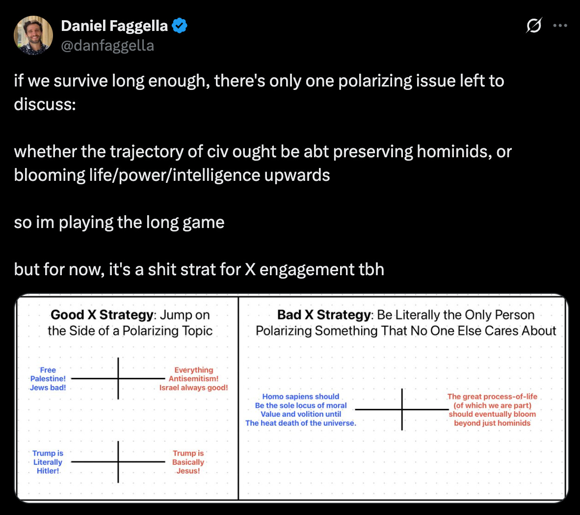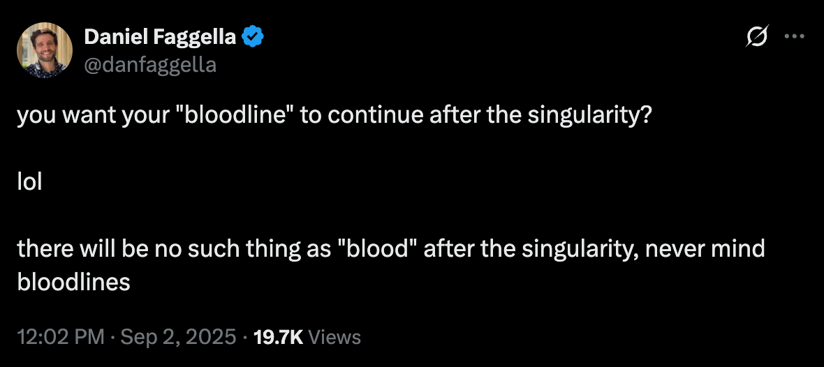 Here are a few tweets of Faggella from just the past few days (as of this writing), to give you a sense of his eschatological belief system: