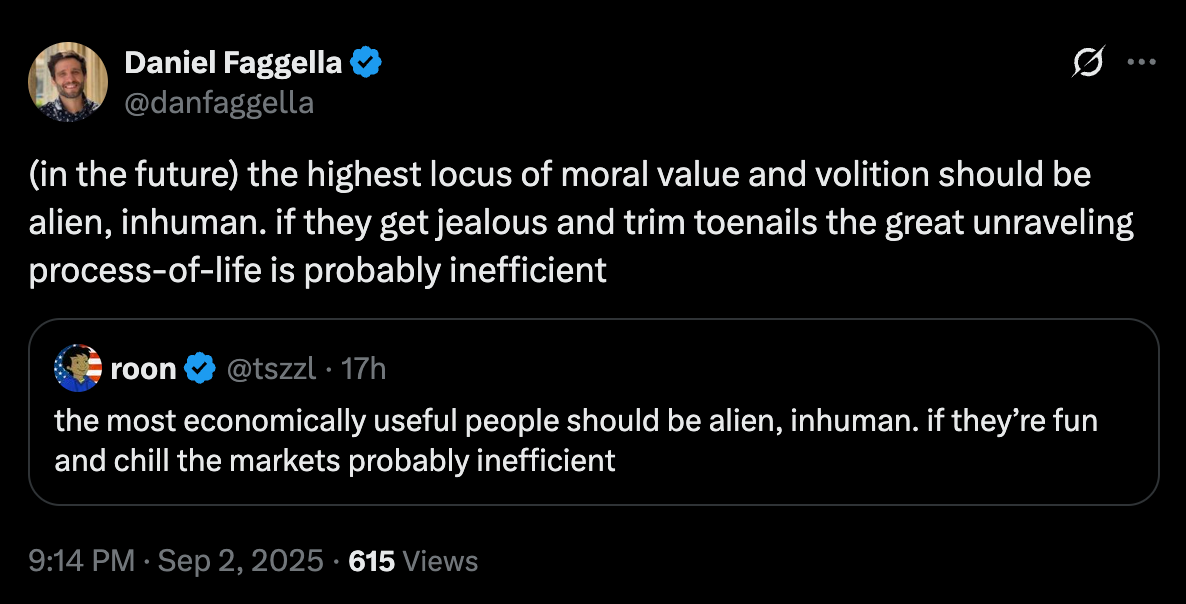 This leads to a philosophical point: Faggella has a profoundly off-putting view of ethics and value, though it’s basically the same as that found among totalist utilitarians.6 He identifies value with the “flame,”7 and creatures like us as the expendable/fungible “torches” that merely carry the flame. This is exactly the way that utilitarians think about people: we’re the expendable/fungible containers, vessels, or substrates of “value.” You and I have absolutely zero intrinsic value. We matter only insofar as we bring this thing called “value” into the universe. It’s a very capitalistic way of thinking about morality, which is why I’ve described the approach as “ethics as a branch of economics.”