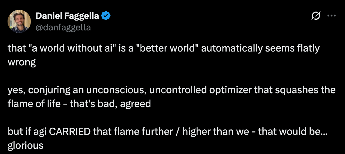 Naomi Klein had a lovely response to a question on Democracy Now about how to counter the growing influence of techno-eschatological fanaticism in Silicon Valley (see time 19:58). Her solution to the problem: an affirmation of life, a belief in our world, because “we’re up against people who are actively betting against the future.” I agree. What Faggella presents, in every important respect, is a vehement rejection of our world and a rejection of Earthly life, in all its magnificent glory. If he were to get his way, everything that makes life worthwhile would be destroyed.10