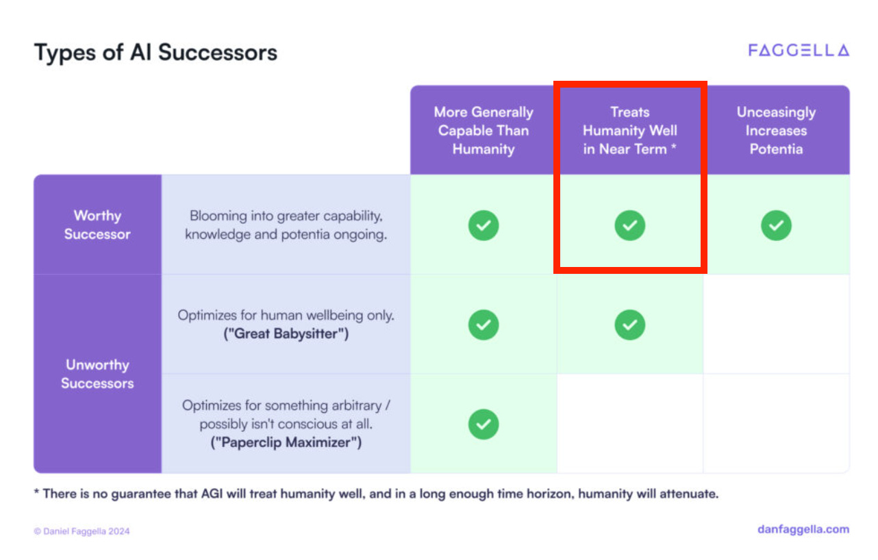 That leaves things like violence, coercion, mass murder, and the violation of human rights as the only plausible ways for AGI to usurp us — a fact that Faggella seems not to have thought much about. He does, however, reassure us that our “worthy successors” won’t do this right away. They’ll at least “treat humanity well in the near term” (paraphrasing the image below), though in the long-term we will be forcibly eliminated — but, Faggella tells us, not in a “reckless” manner. Umm, how, then will it get rid of us?