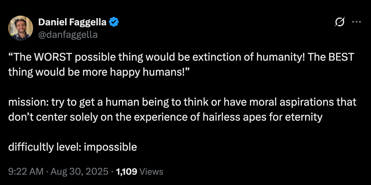 Earlier this year, Faggella held a “Worthy Successor: AI and the Future After Humankind” conference in a San Francisco mansion (where else?), which he claims was attended by “team members from OpenAI, Anthropic, DeepMind, and other AGI labs, along with AGI safety organization founders, and multiple AI unicorn founders.” This points to the appetite that Silicon Valley dwellers have for pro-extinctionism.1 According to a recent announcement, Faggella is planning another such conference later this month in New York City, which aims to place “diplomats, AGI lab employees, AI policy thinkers and others into one room to discuss the trajectory of posthuman life.”2