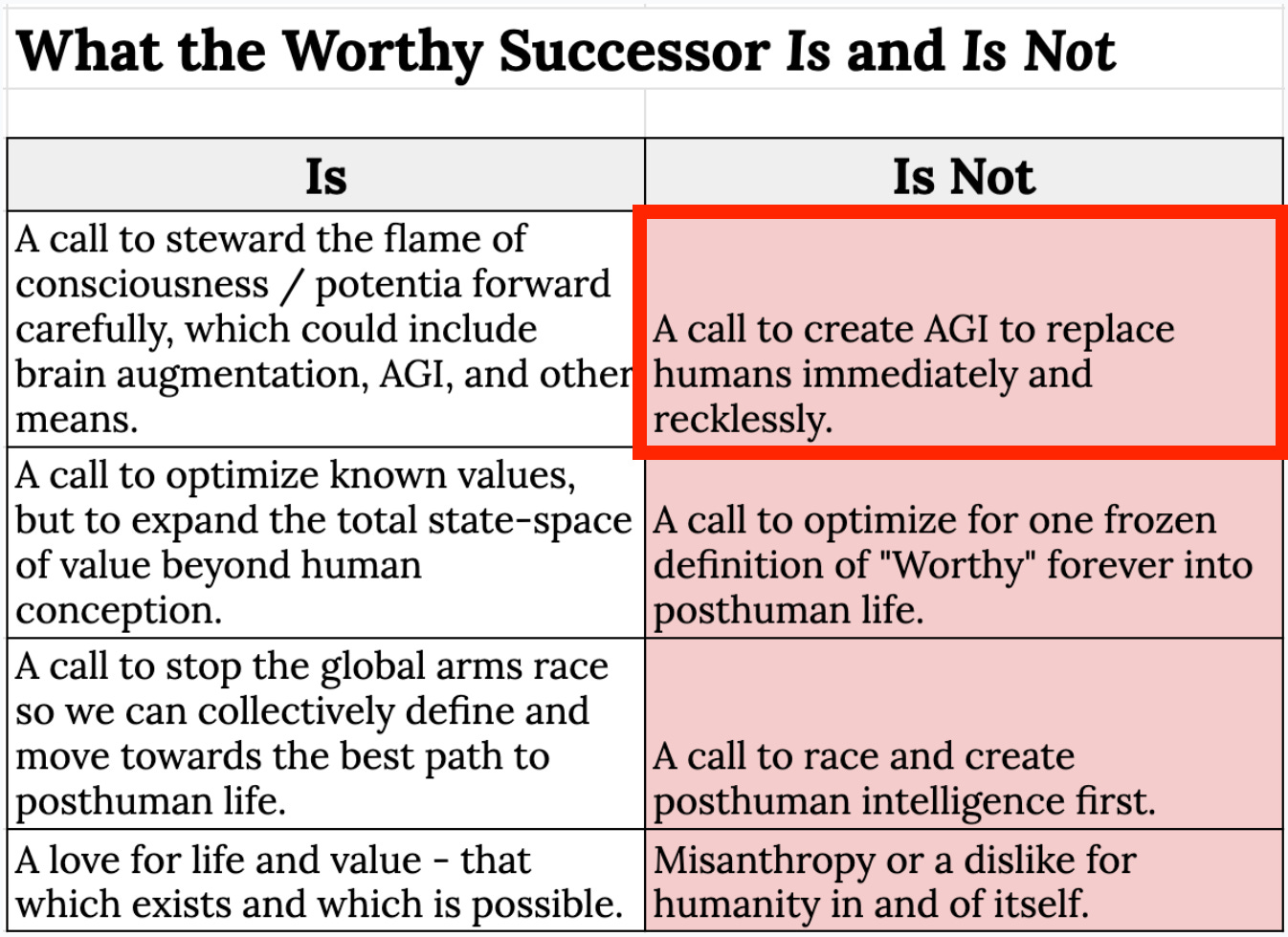 It’s an even more appalling version of pro-extinctionism than that advocated by the Gaia Liberation Front, since even they want nonhuman organisms to persist. Faggella’s view is closer to Efilism, which aims to snuff out all life in the universe — the only difference is that Faggella wants a very particular kind of AGIs to do this snuffing out, after which they will immediately start building AGI+, which will immediately build AGI++, etc. until the universe is full of all sorts of alien beings engaged in constant war (because, again, the cosmopolitical realm is anarchic).