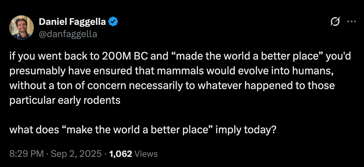 One sees this in Faggella’s approach. Like the utilitarians, he gets things exactly reversed: we matter for the sake of value, on his view, rather than value mattering for the sake of us. This is precisely why he advocates eliminating humanity in the future by replacing us with AGIs. These AGIs, in turn, won’t matter anymore than we do, because they’ll also be mere expendable/fungible “torches” whose moral significance is entirely bound up with their capacity to carry the “flame.” In a phrase: Faggella claims to care about “life” and “consciousness” yet doesn’t care about any of the things that are alive and conscious.