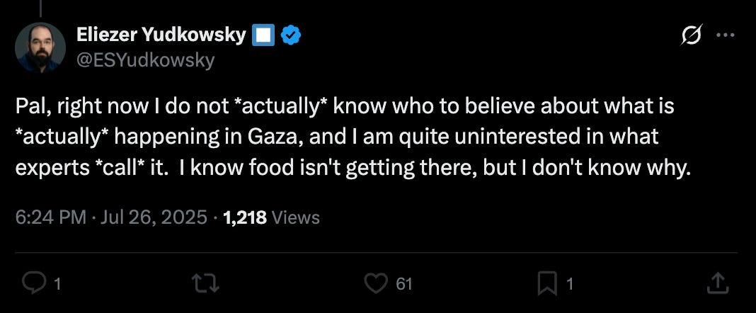 EAs like to see themselves as morally superior, yet the movement’s most influential figures won’t even speak out about the most morally salient issues of our time. They warn about the possibility of omnicide — the death of all humans, thus foreclosing our “glorious transhumanist future,” quoting Yudkowsky — yet they can’t bring themselves to publicly acknowledge the first genocide live-streamed in human history (Gaza). That is not altruism. It’s moral turpitude and cowardice.